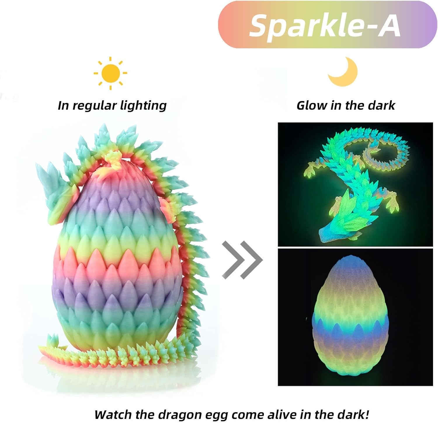Due to the use of 3D printing materials, each dragon egg comes in a unique color. When viewed from different angles, the color of the dragon egg changes, so rest assured, each and every dragon egg is dazzling and eye-catching.