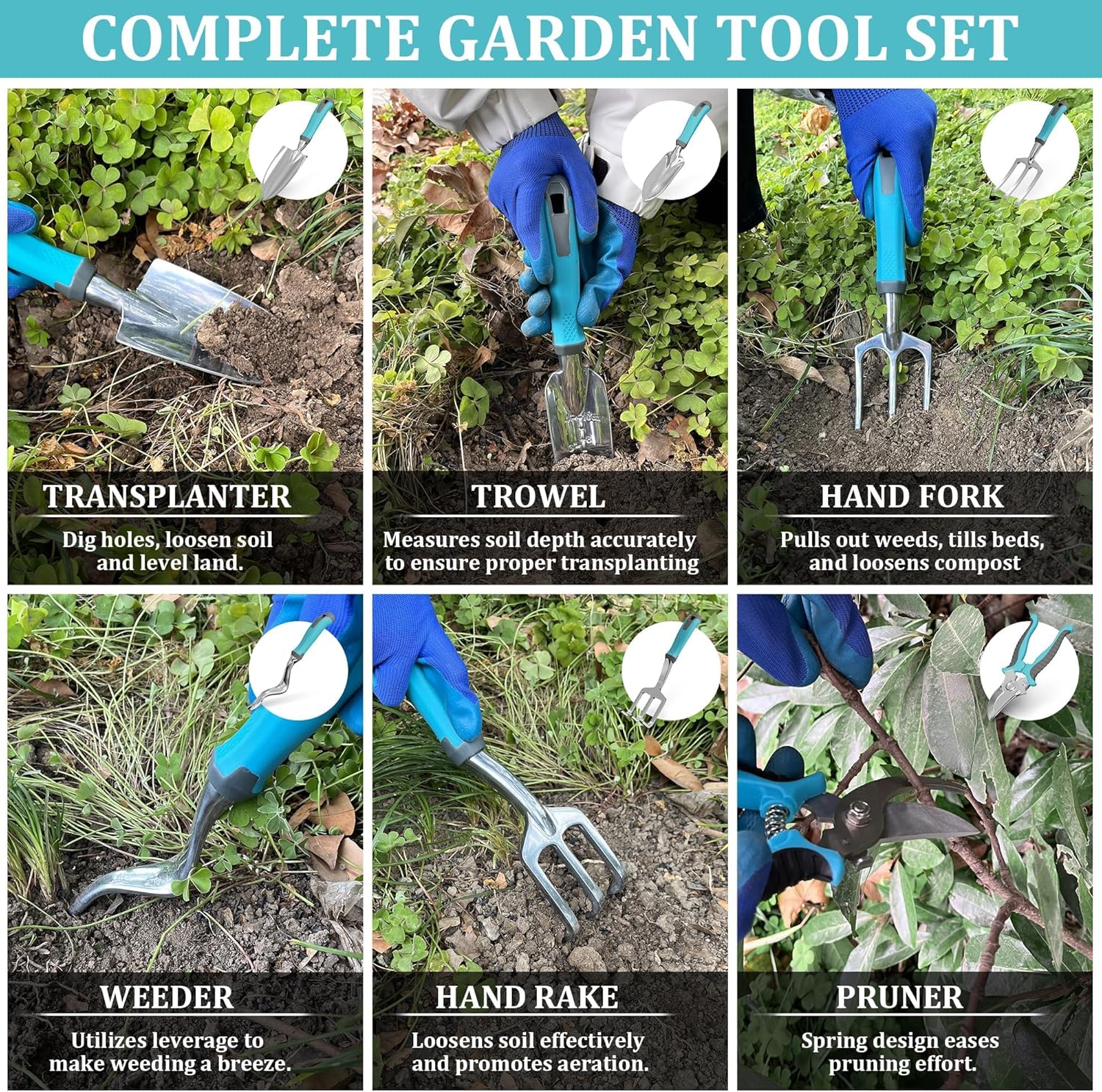【WHAT YOU WILL GET】1 x Pruner;1 x Weeder;1 x Trowel;1 x Hand Rake;1 x Transplanter;1 x Hand Fork;1 x . Repotting Mat;1 x Gloves;1 x Carrying Tote
