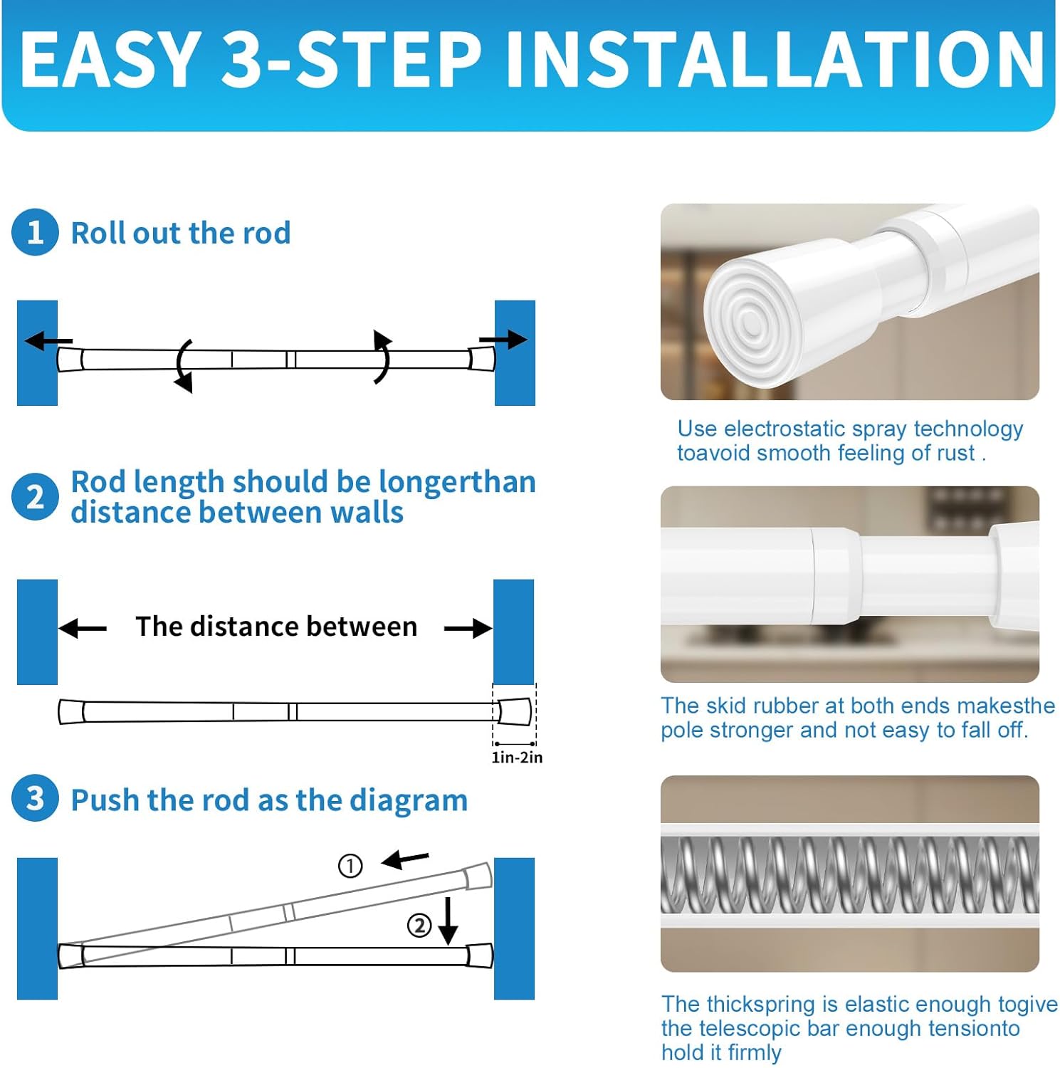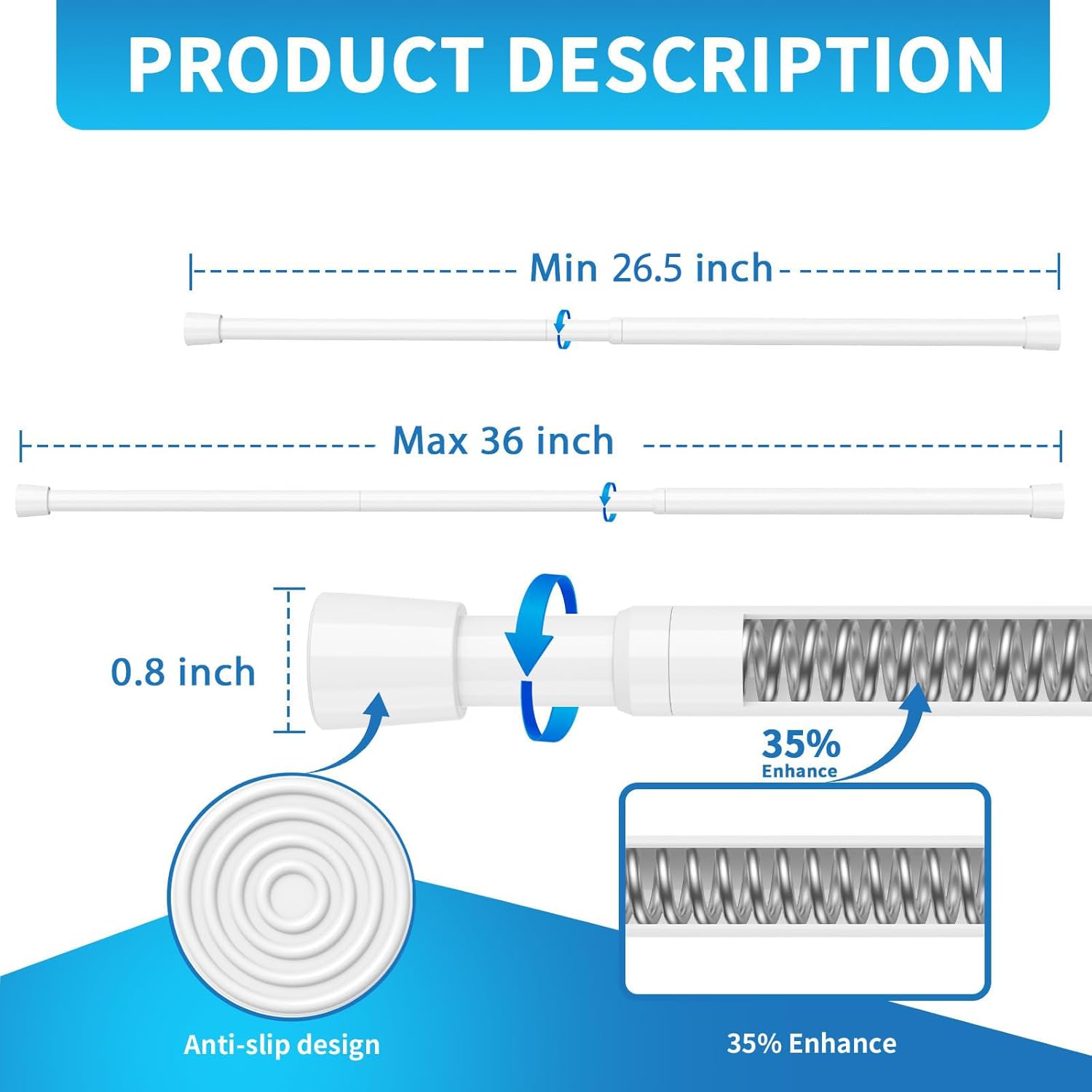 【Premium Material】The white tension rods body is made of sturdy 50CrVA high carbon steel material, with an internal 2.5MM reinforced spring providing a support force of 6.6 pounds.