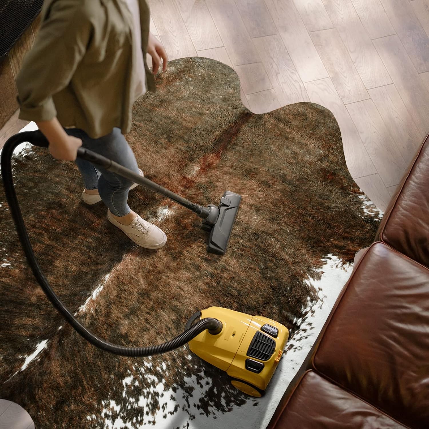 Easy to clean: This faux cowhide rug can be vacuumed on a light setting for effortless upkeep; Spots and spills can be easily cleaned with a damp cloth using a small amount of soap if necessary