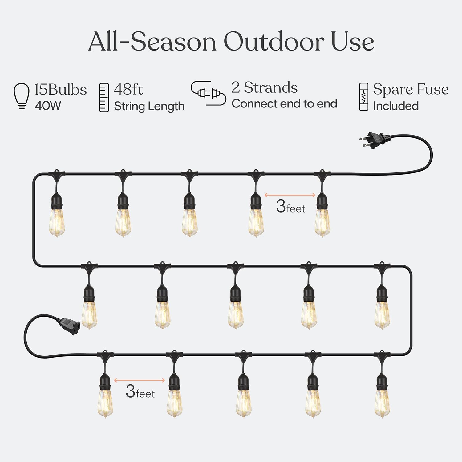 A Canopy of Alexa Compatible Outdoor String Lights: 48 ft long string lights with 15 hanging 40-watt bulbs spaced 3 feet apart. Brightech porch string lights are approved for residential and commercial lighting. Works with Alexa to turn on/off, requires hub sold separately. Connect up to 2 strands end to end.