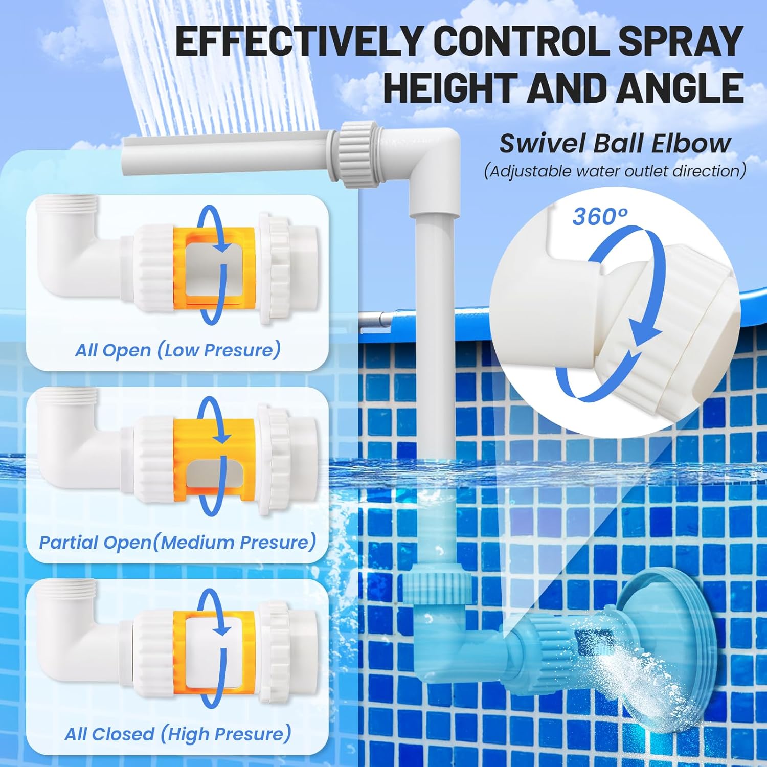 🔧 Adjustable Pond Spray Height and Angle – Pool water spray is adjustable height up to 16.4ft, depending on the pump used (0.75HP sand pump injection distance up to 10 meters, 0.1HP/1000 gallons/80W ordinary filter pump (HP=80/745.7) injection distance of about 4 meters, 0.02HP/530 gallons/15W ordinary filter pump can not be sprayed at all). Free swivel the direction of water flow by rotating ball elbow to customized water flow, and adjust the bottom side valve to control the water pressure