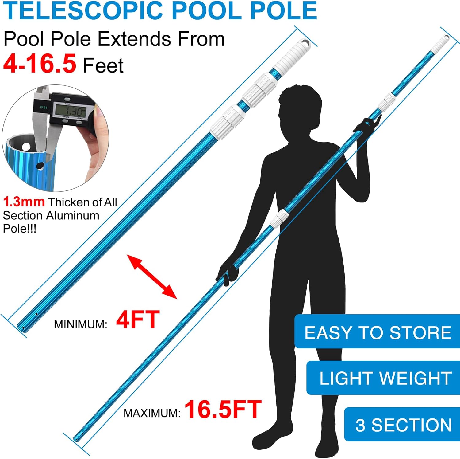 🆕【Telescoping Pole Expands Up To 16.5 Feet 】3 Section Pole, 2 Slip Resistant Locking Gam and Striped Rubber Head with Lifting Ring Design – Makes it easy to lock the pole length in place and keep the length in place without it slipping while in use. ⭐Expands in length from 5.5 Feet up to 16.5 Feet⭐, which provides you the extra reach needed when cleaning a wide and deep swimming pool, suitable for most in ground and above ground swimming pool.