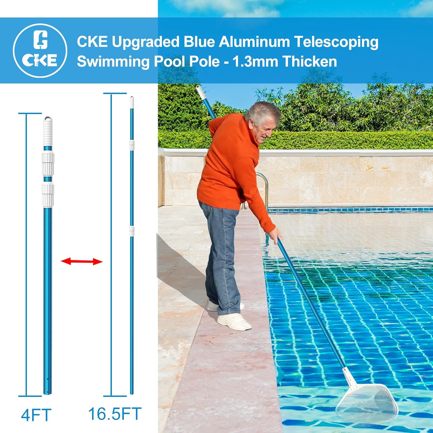 CKE Upgraded 16.5 Feet Thicken 1.3mm Blue Aluminum Telescoping Swimming Pool Pole,Adjustable 3 Piece Expandable Step-Up,Attach Connect Skimmer Net,Rakes,Brushes,Vacuum Head with Hoses, Universal 1.25″