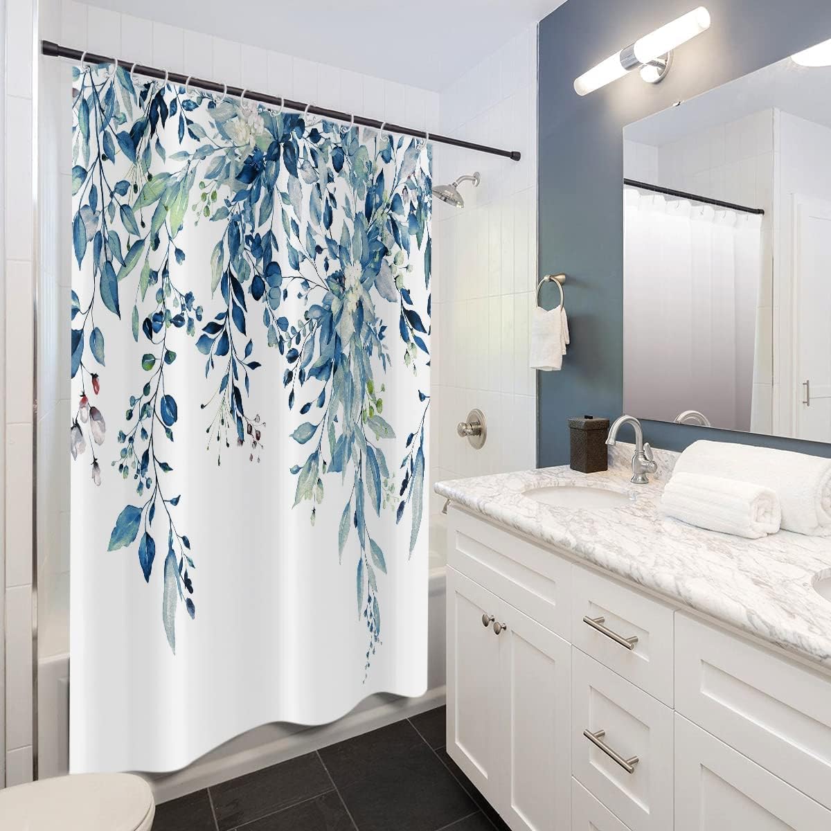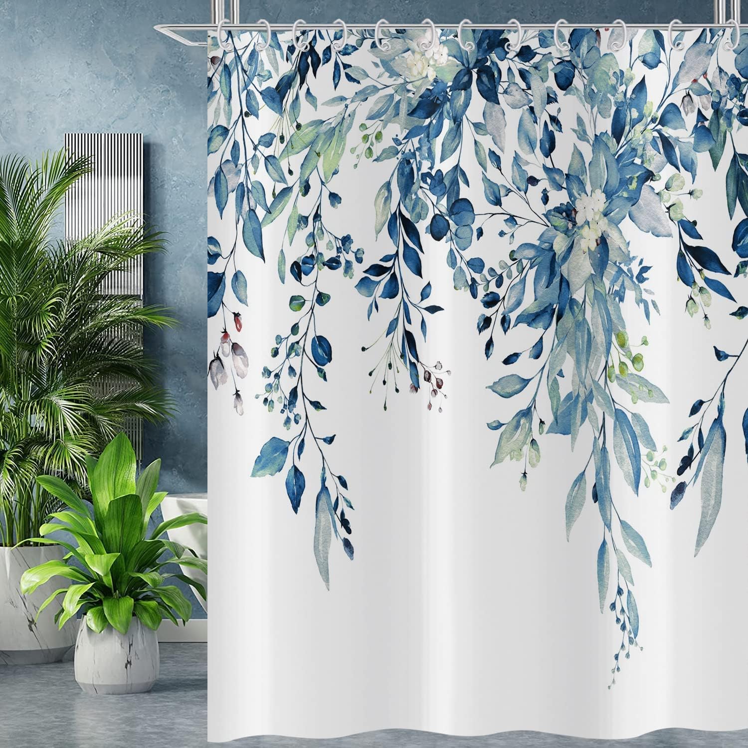 Eucalyptus Shower Curtain, Watercolor Blue Leaves on The Top Plant with Floral Bathroom Curtain Bathtub Home Decor Waterproof Fabric Machine Washable with 12 Hooks