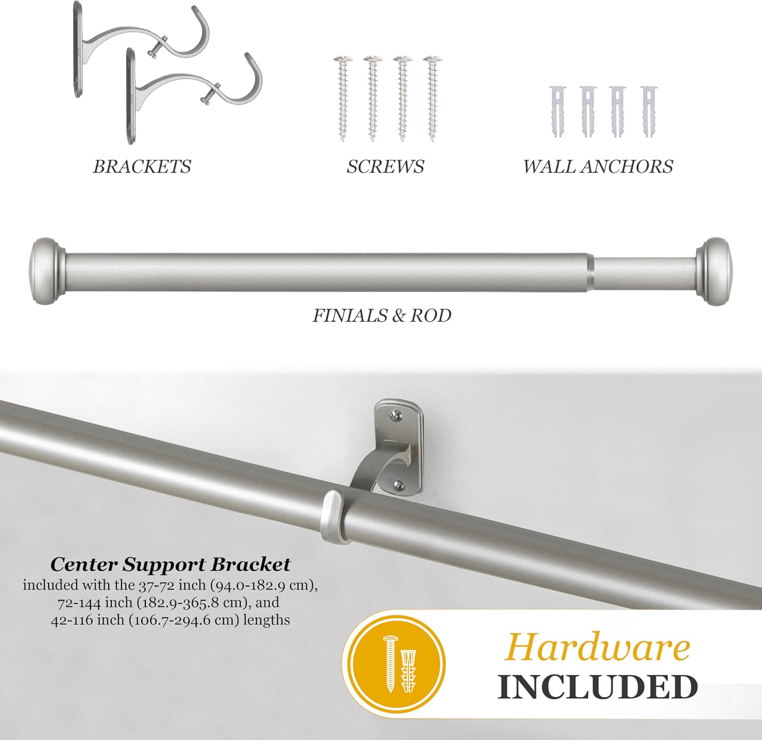 COMPLETE SET: Includes one telescoping extendable curtain rod, two curtain rod brackets, one center support, screws, and drywall anchors – everything you need for hassle-free installation