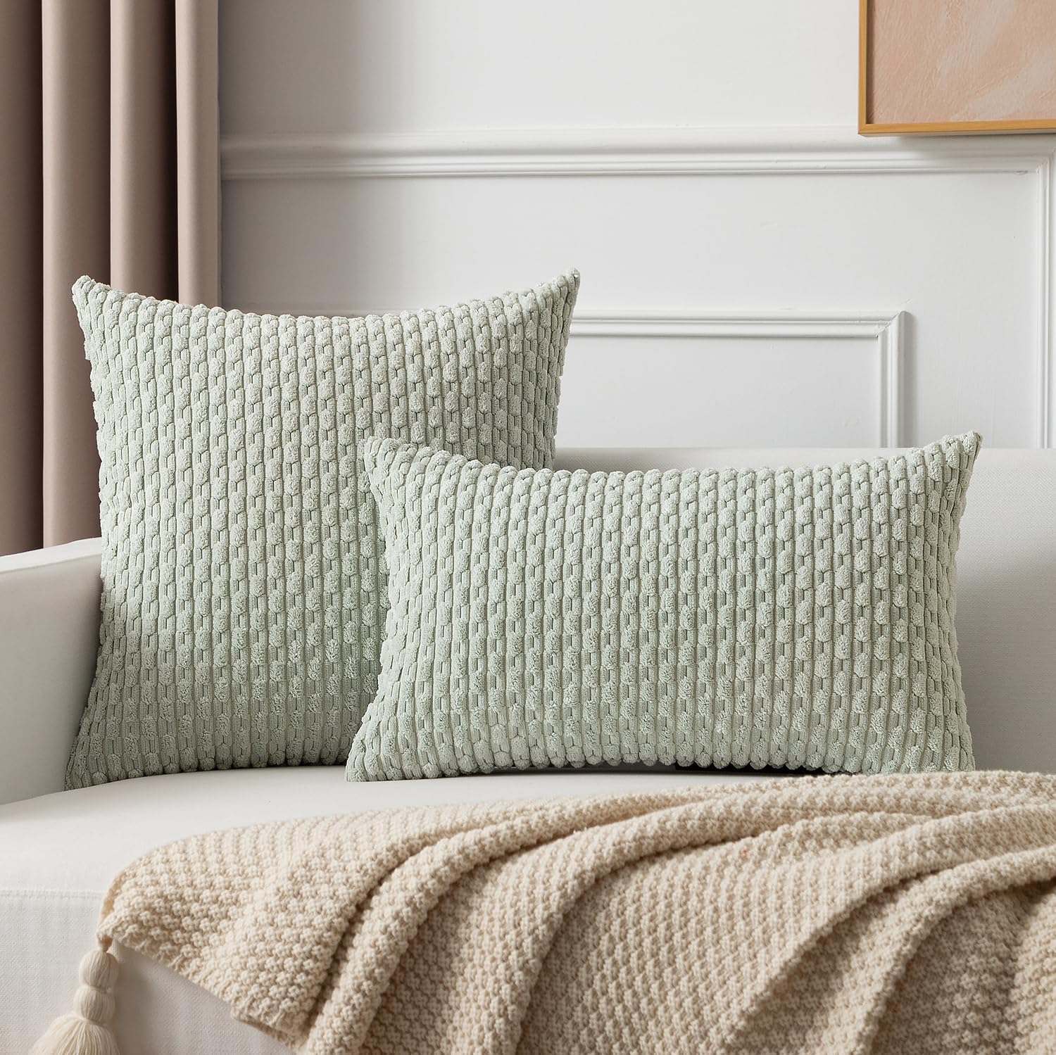 Kevin Textile 2 Packs Light Green Decorative Throw Pillow Covers 18×18 Inch for Living Room Couch Bed Spring Sofa Soft Striped Corduroy Square Cushion Case 45×45 cm Rustic Farmhouse Boho Home Decor