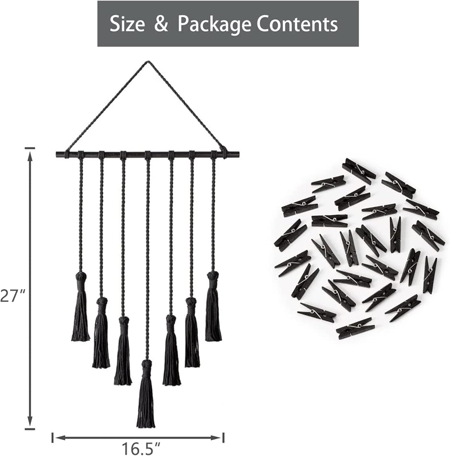 Materials: cotton cord and wood dowel, with 25 removable wood clips. Gorgeous, high quality and chic decor, suitable for indoor use. The props are not included in this item!