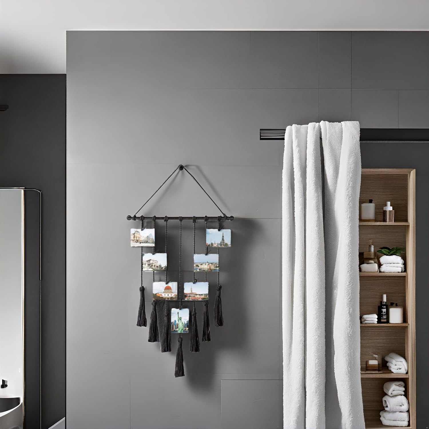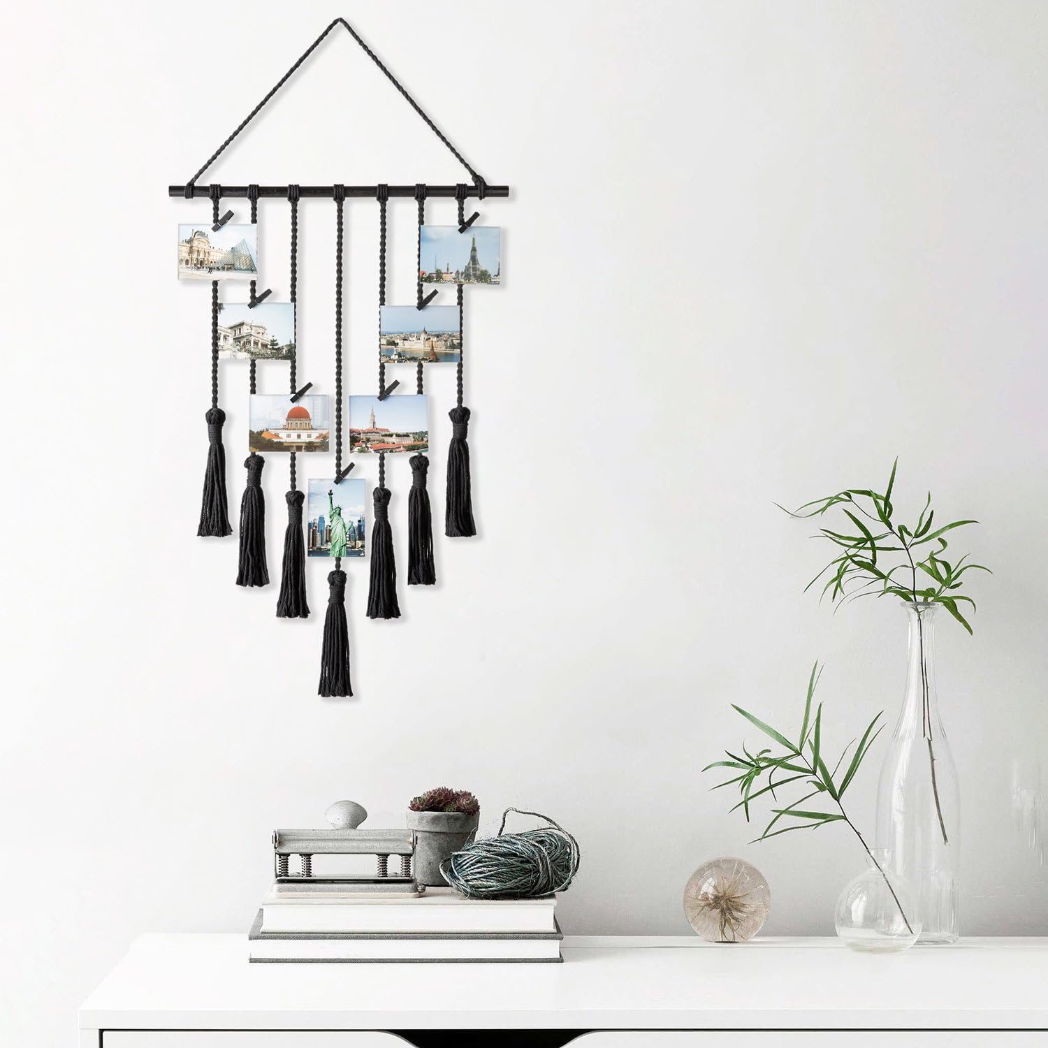 With this macrame print artwork display, you can give your custom wall art a makeover and refresh your home decor any time you want by simply removing or adding photos with removable wood clips.
