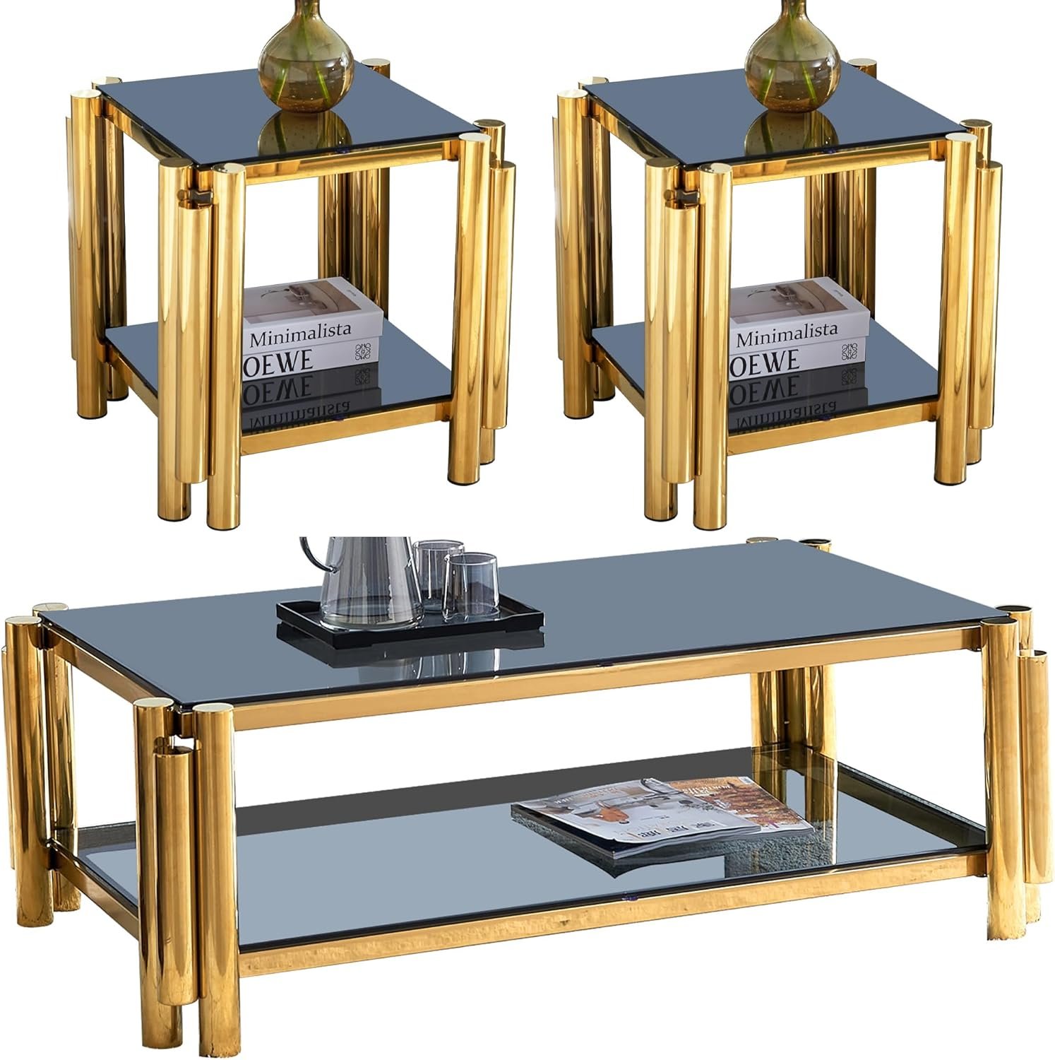 Black Glass Coffee Table Set of 3, Luxury Gold Coffee Tables...