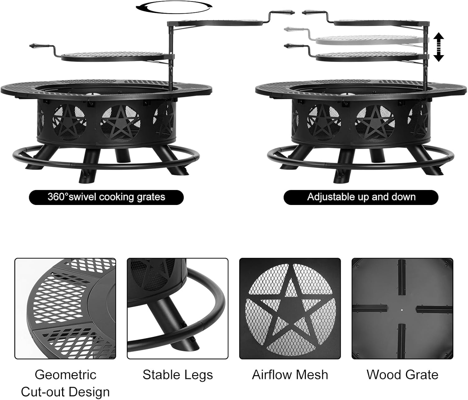 [Beautiful & Humanized Design]OutVue fire pit table comes with 2 height-adjustable and 360° swivel grills which disassemble freely. You can barbecue, keep food warm or put pan to cook on them. The side of wood-burning fire pit is created with classic stars cut-out design which catches firelight for creating fun shadows. The drilled design promotes airflow and keeps the fire strong. All sophisticated designs of the fire pits for outside are dedicated to the warmth and comfort for you.
