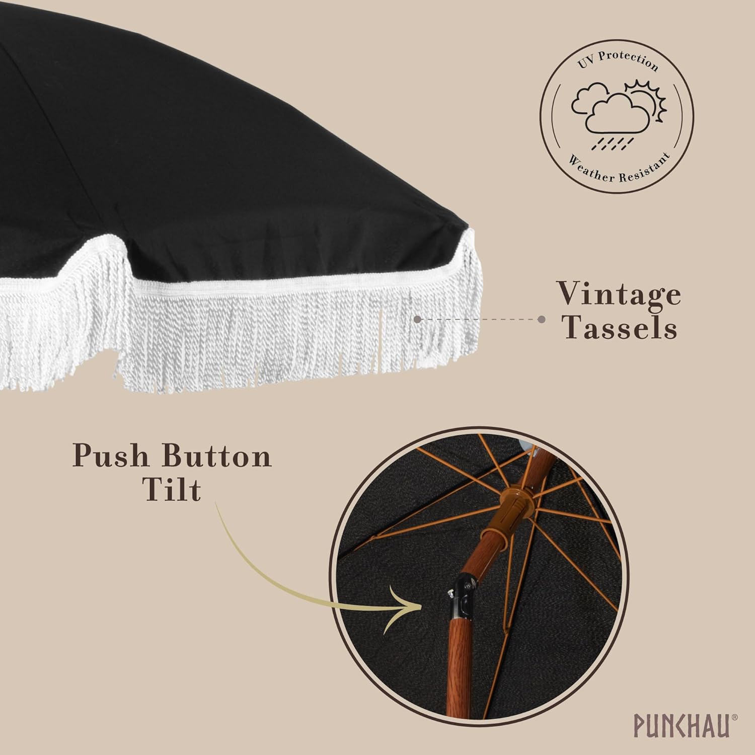 8 reviews for 6 Ft Fringe Patio Umbrella – Outdoor Umbrellas for Patio, Pool, Table, Garden, Deck, Beach, and Outdoors – Fashionable Boho Vintage Tassels & Wood Print – Push Button Tilt Pole