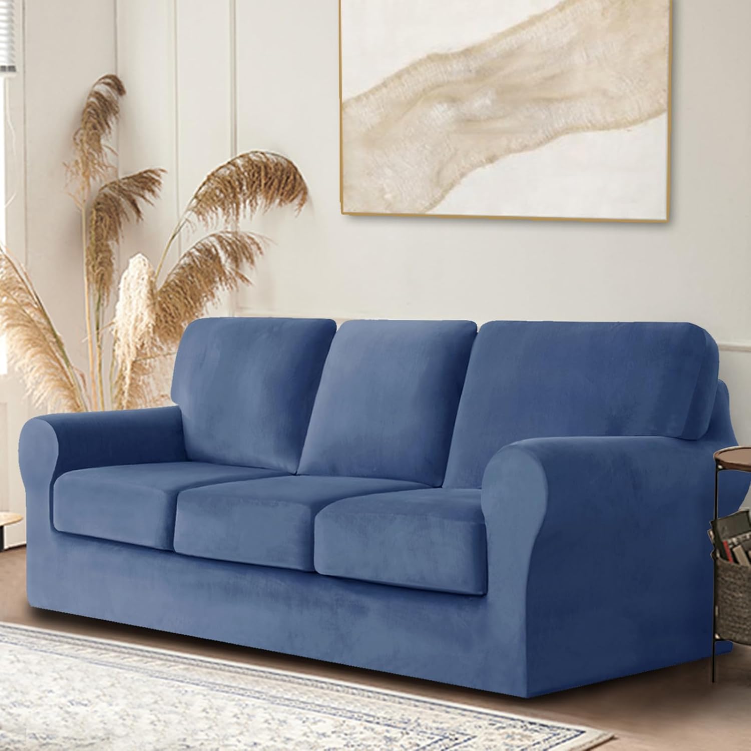 8 reviews for 7 Pieces Velvet Stretch Sofa Covers for 3 Cushion Couch Covers Luxury 3 Seater Couch Slipcover with 3 Backrest Covers and 3 Cushion Covers with Elastic Band (Navy, Large)