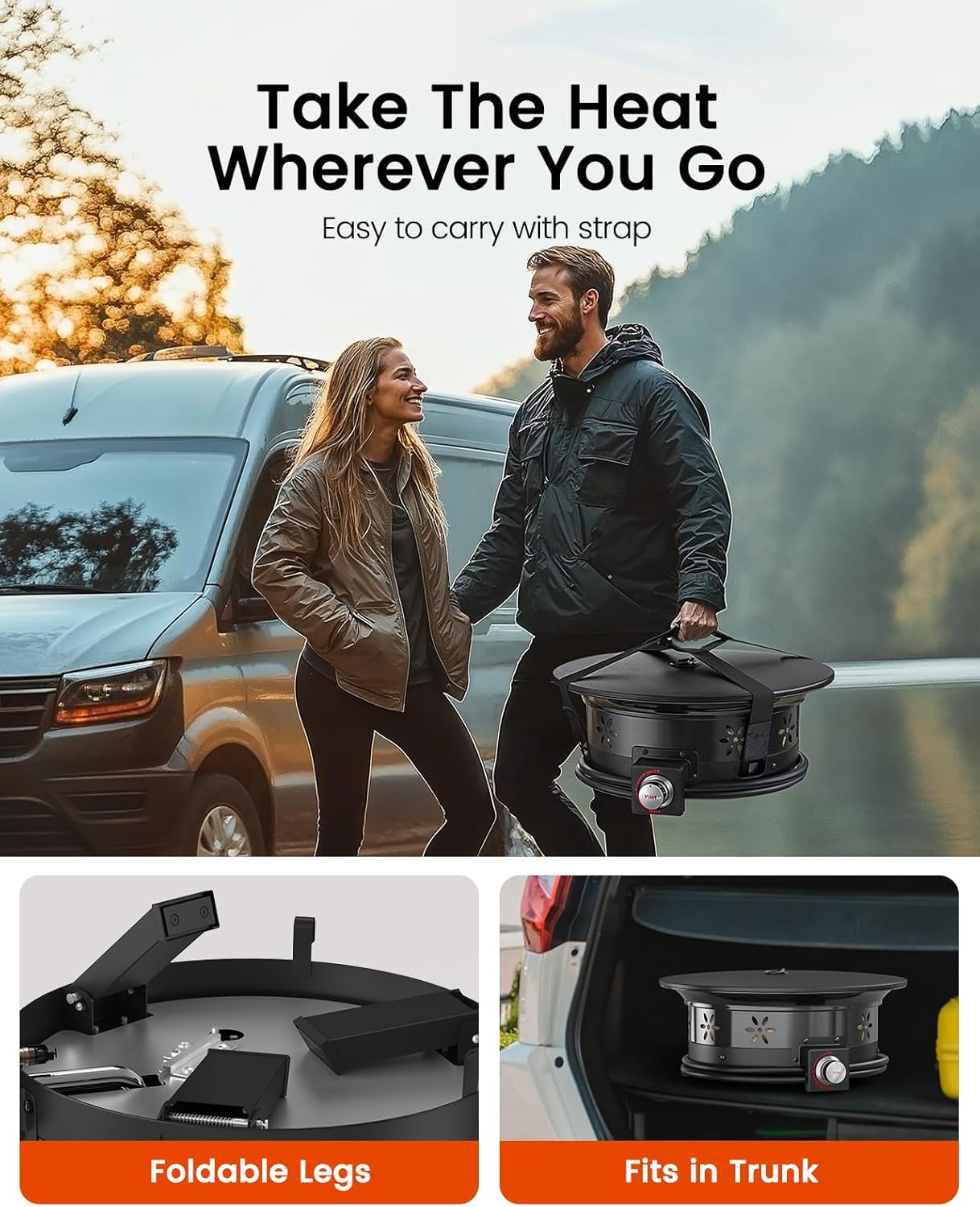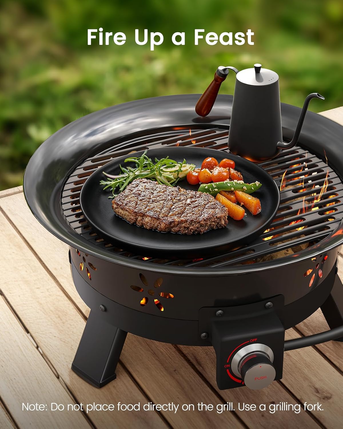 Let me tell youâthis fire pit gets it. I wanted warmth, ambiance, and maybe the ability to roast a marshmallow or two without feeling like I just smoked 10 briskets. And boom: this gas-powered wonder DELIVERS.With a toasty 58,000 BTUs of heat, itâs like giving your backyard (or campsite) a big warm hugâwithout coughing through smoke like youâre reenacting a foggy London mystery novel. Setup is easier than convincing someone to join you around it. Just press, twist, and voilà âfire! No batteries, no lighter, no rubbing sticks together like a caveman with anxiety.The CSA certification and safety features gave me real peace of mind. Flame goes out? No problemâit shuts itself off faster than my uncle leaving when the bill comes. Plus, it wonât torch your grass, so your lawn stays pristine, and you stay on your neighborâs good side.But waitâthereâs a grill! A legit cast iron grate that lets you cook up campfire steaks, heat water for cocoa, or just look rugged while you sip wine in your backyard. (Pro tip: don’t put food directly on it unless you enjoy iron-flavored hot dogs.)Itâs portable, folds up neatly, and comes with lava rocks, a tank holder, cover, and strapâbasically everything but the ghost stories.Final verdict: This fire pit is fire. ð¥ Cozy vibes, safe design, portable power. Whether you’re glamping or just pretending your driveway is the Grand Canyon, this thing brings the heatâand then some.