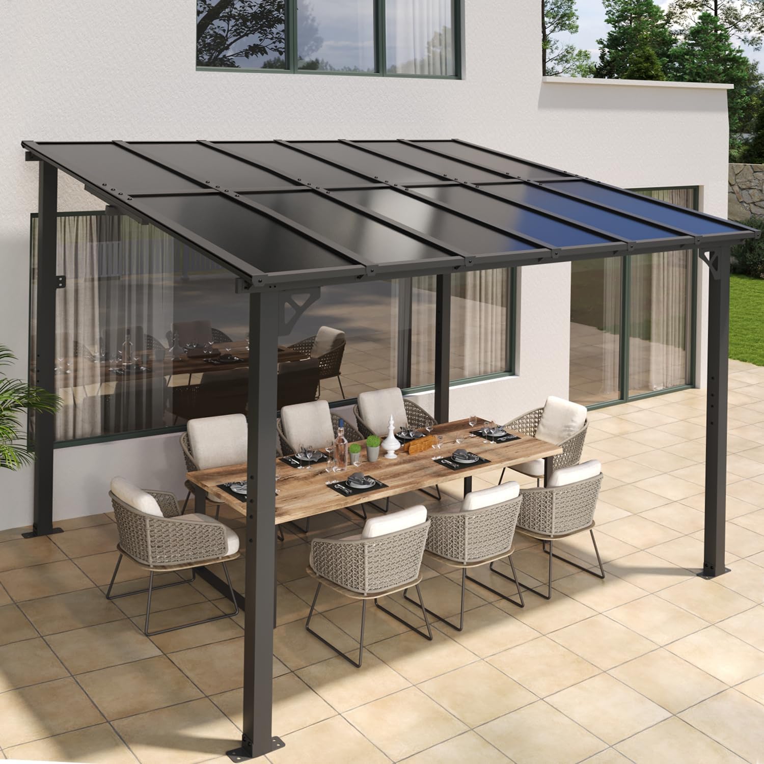 【Sloped Roof and Gap Drainage】Sloped roof design make the rainwater run off the eaves smoothly and easily, reducing the problems of water accumulation. This patio pergola also features gap drainage to help better drain water.