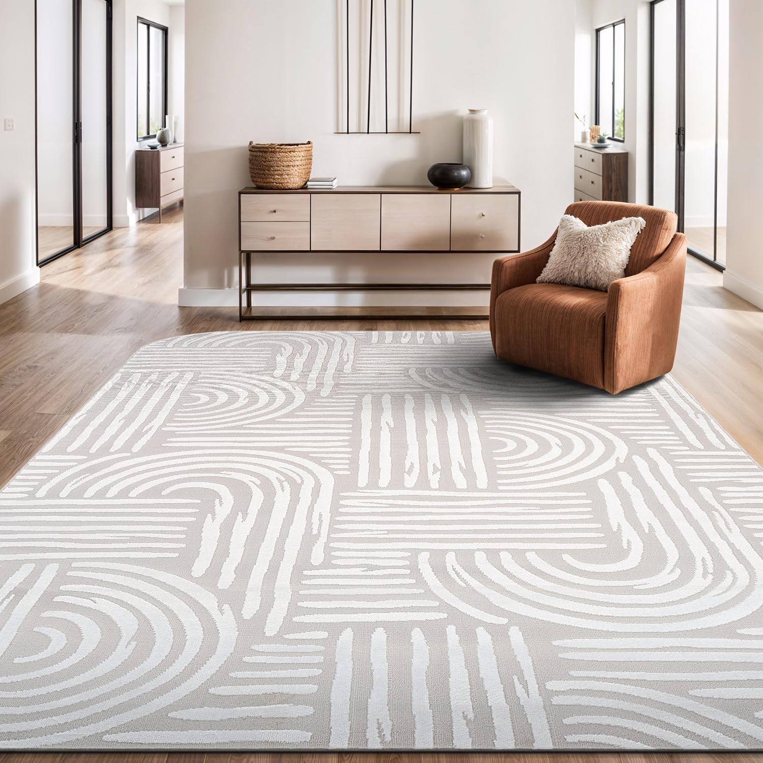 8 reviews for Beverly Rug Modern Geometric Area Rug 8×10 Low-High Pile Durable Soft Abstract Curved Indoor Rugs for Living Dining Room Office Stain Resistant Non Shedding Casual Indoor Carpet Beige White 8 x 10
