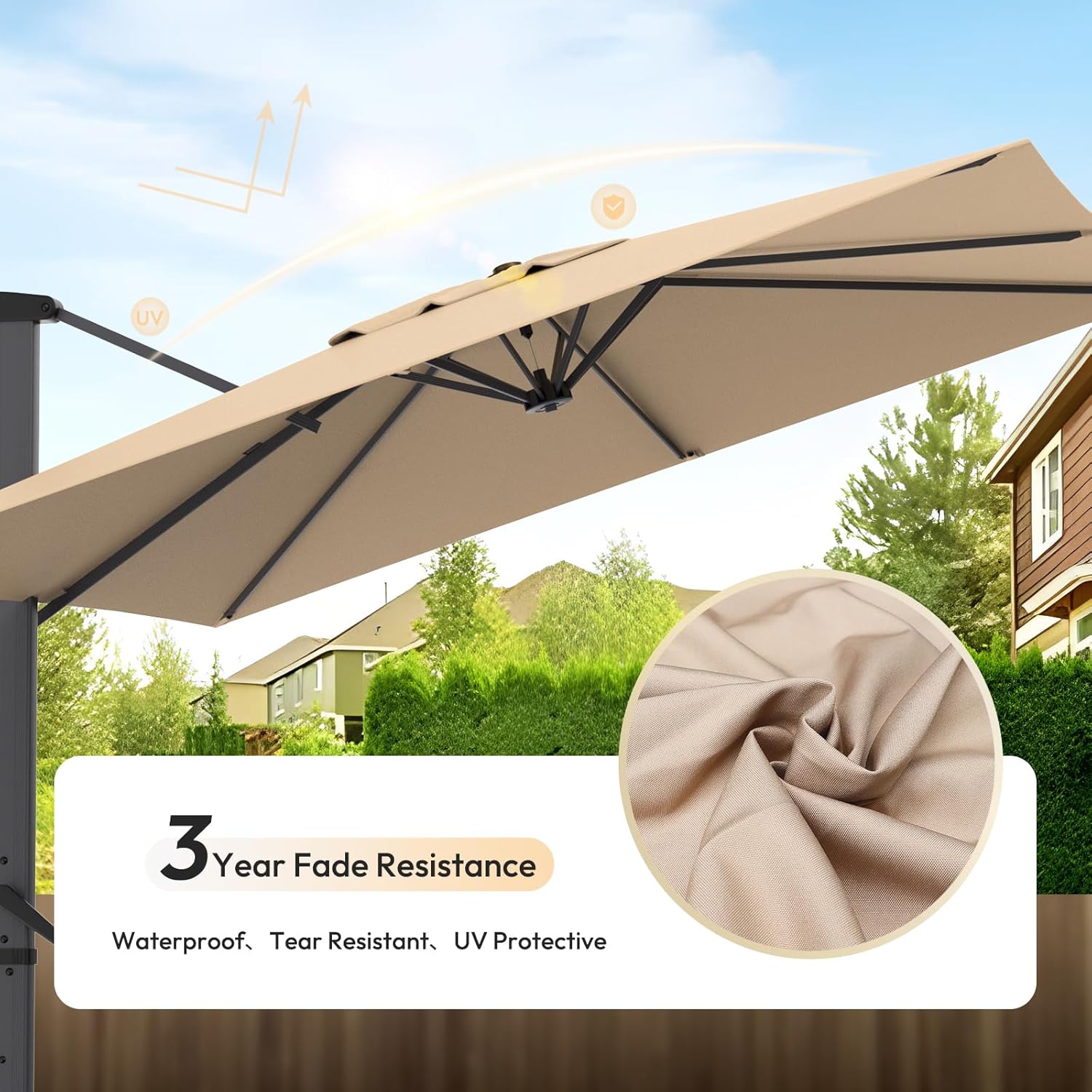 FADE/RIP-RESISTANT AND WATERPROOF THICKER CANOPY: Lotus leaf-inspired creativity, the canopy of this rectangular cantilever patio umbrella is made of waterproof 250/gsm yarn-dyed polyester fabric with PU coating, water hardly seeps through the fabric at the top on rainy days, while less sun penetrates through the fabric and avoid fade quickly in the sun, PU coating isolates partial heat and 99% UV, allowing you to enjoy a relative cool shade under the umbrella.