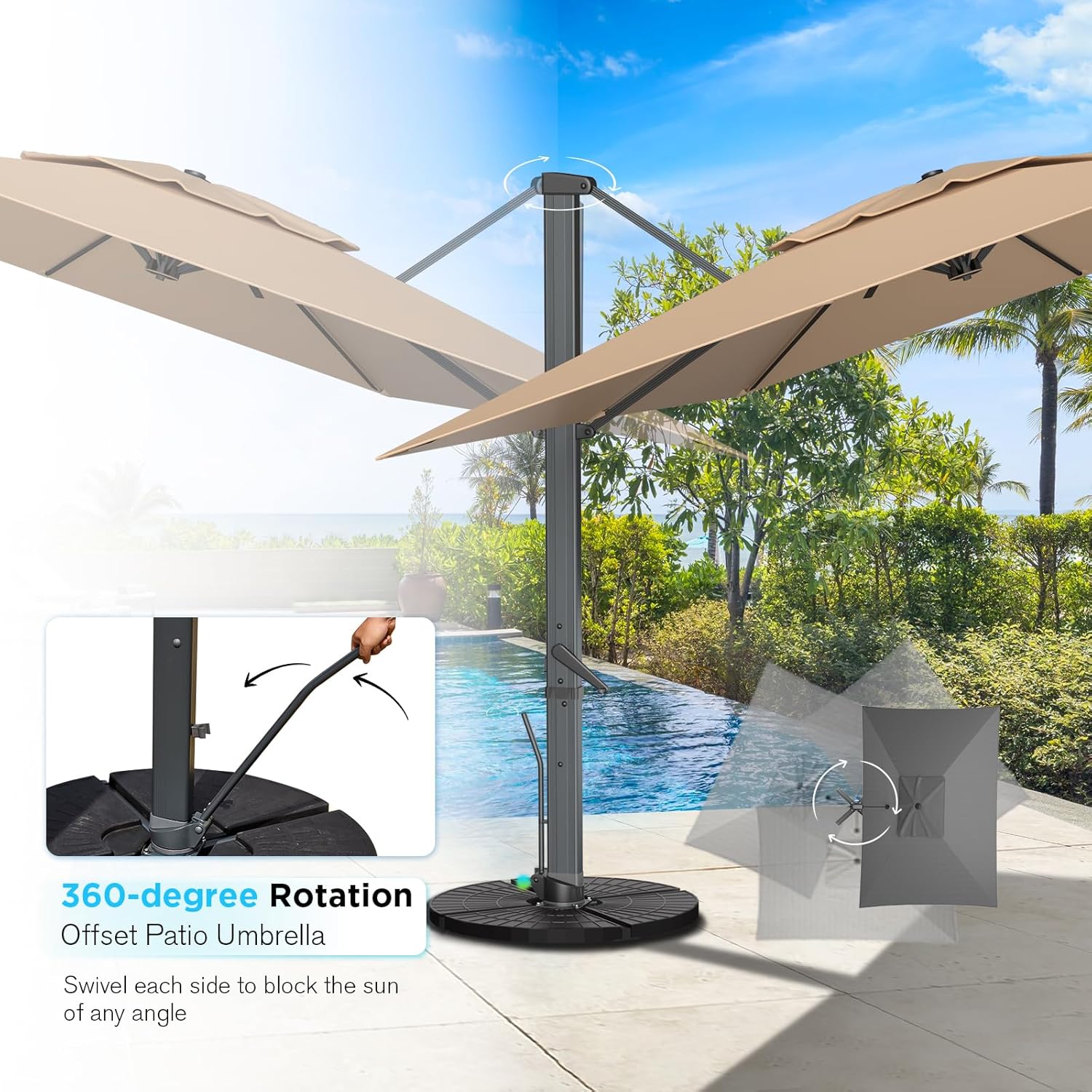 DJUSTS TO ANGLE OF SUN WITH VERY LITTLE EFFORT:360°Rotation and tilt adjustable mechanism make this cantilever patio umbrella work at different angles to create shade no matter where the sun is in the sky, turn hand cranks to swive to each side with the movement of the sun or tilt it up and down to apply on any narrow end of an area, Shade and cool any area