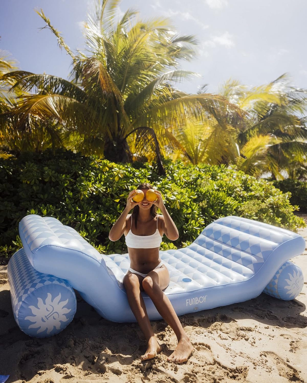 Luxury meets summer fun. THE ULTIMATE ORIGINAL FLOATING DUAL CHAISE LOUNGER FOR TWO ADULTS! THE MOST RELAXING FLOAT ON THE MARKET. USE IN WATER OR ON LAND! Beautiful blue check print with sun detail on the chaise support chambers.