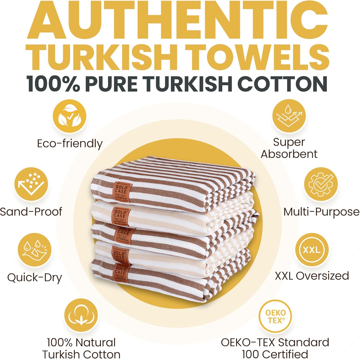 Gold CASE Turkish Beach Towel Set of 5 – 100% Cotton Large Turkish Bath Towels 71 x 40” – MYRA Oversized, Quick Dry & Sand Free Beach Towel – Lightweight Towels Set in Mocha Mousse
