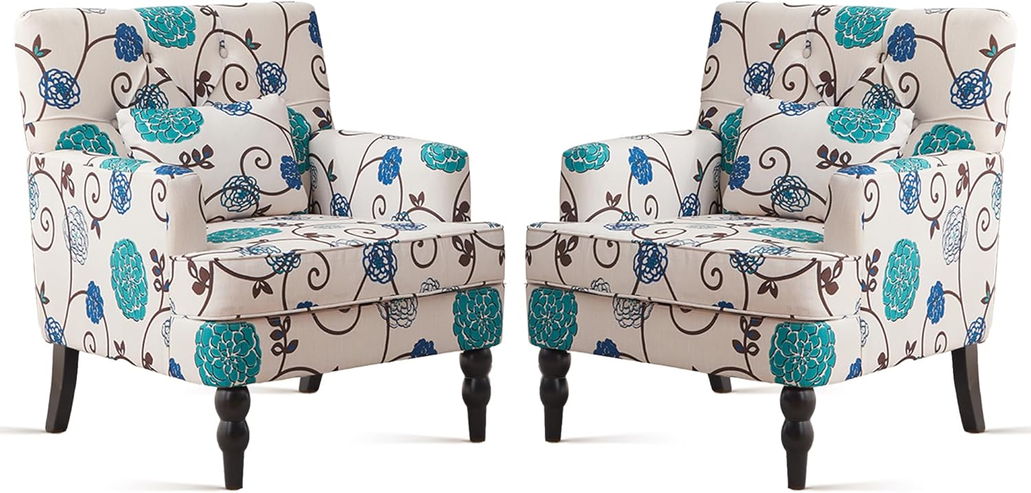 HUIMO Accent Chair with Pillow Set of 2,Upholstered Button Club Chair, Tufted Living Room Chairr,Armchair, Fabric Sofa Chairs for Bedroom, Mid Century Modern Reading Chair (2,Blue Flower)