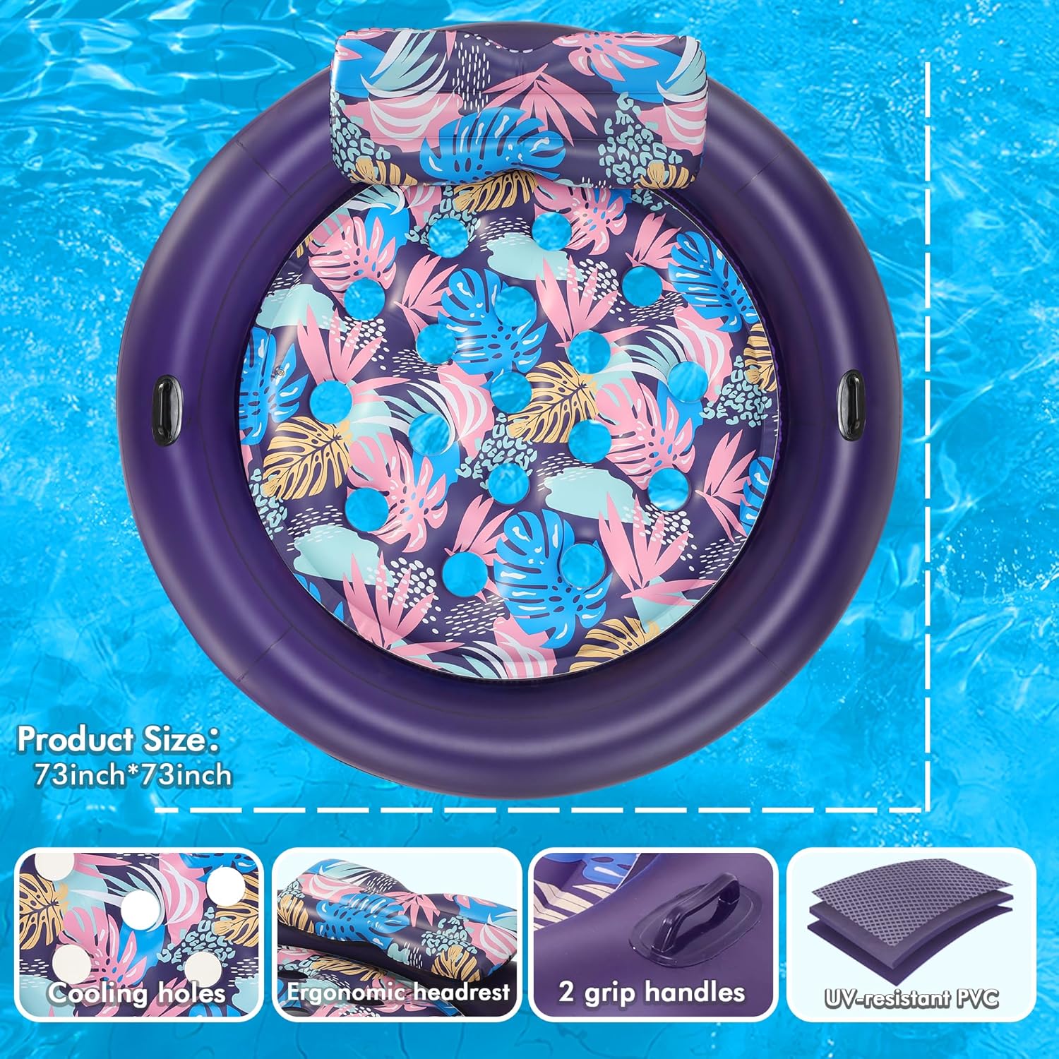 Cooling and Balance: With 19 cooling holes for optimal water contact, this float keeps you cool and comfortable all day. Two grab handles ensure easy mobility and balance, offering a stable and relaxing sunbathing experience in the pool, lake, etc