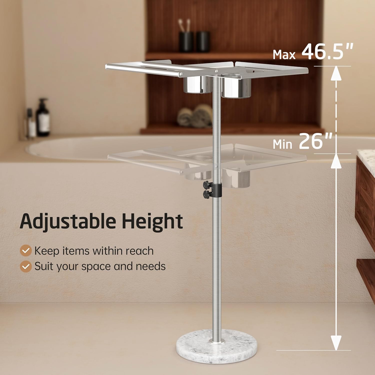 3-Step Easy Assemble: Just place the marble base on a flat surface and install the rod with base ring onto the bottom of the marble base and install the bath tub tray by tightening the screws. Then you can easily place this anywhere