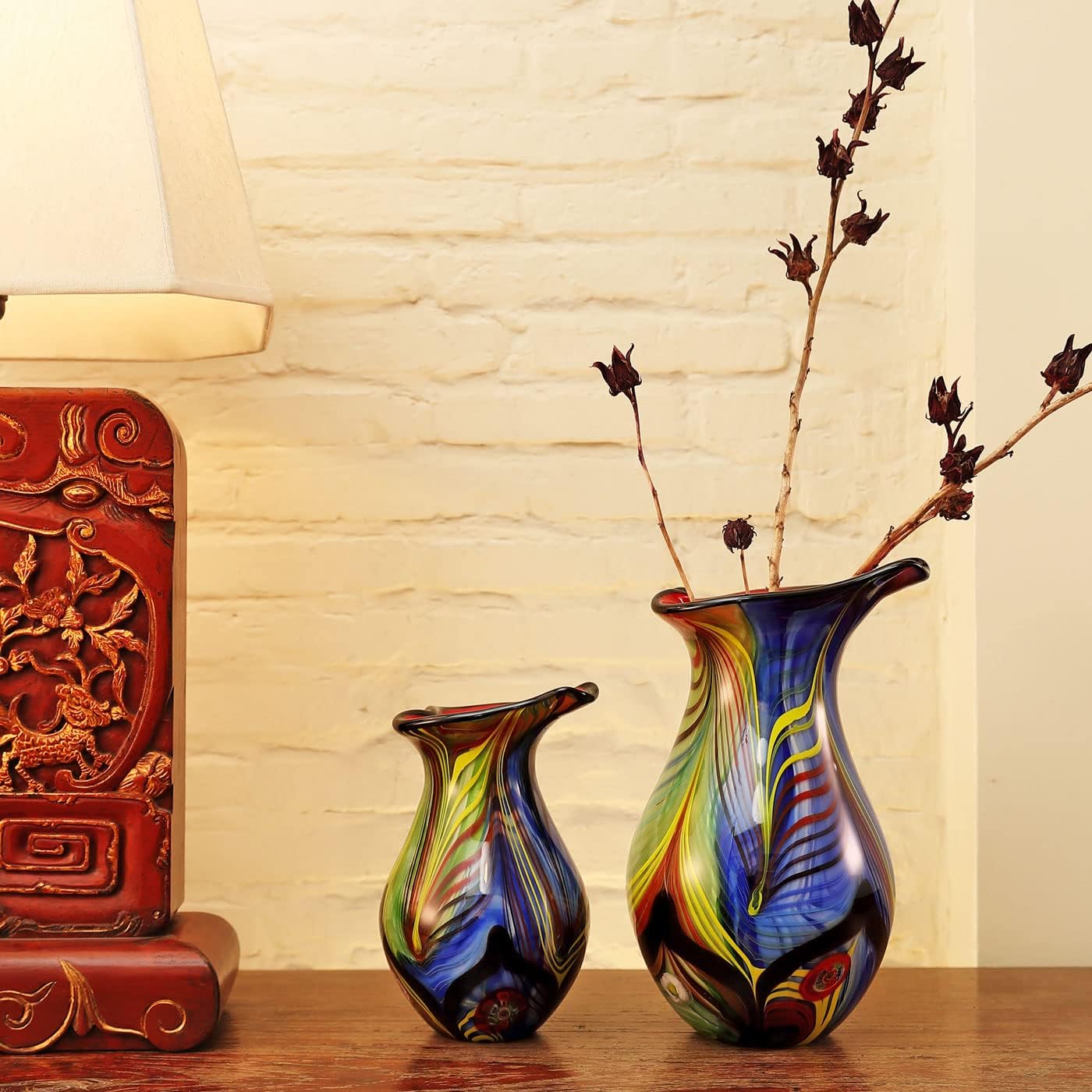 Luxury Lane Hand Blown Abstract Teardrop Art Glass Vase for Decor Centerpiece Table Decoration 13.5 inch Tall Multicolor