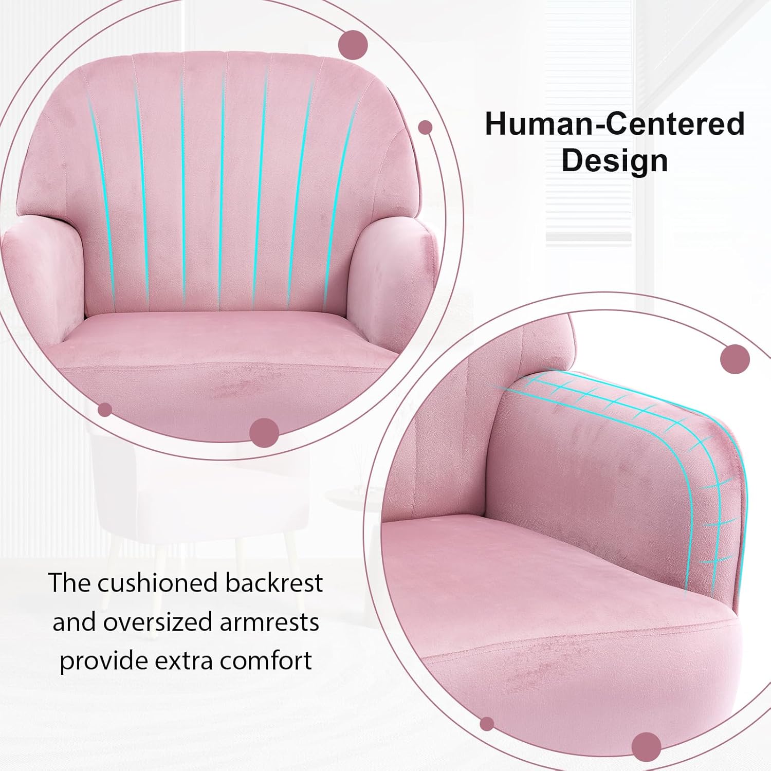 Modern Velvet Accent Chair, Comfy Upholstered Single Sofa Side Chair with Armrests and Back, Luxury Barrel Armchair with Metal Legs for Living Room, Bedroom, Office and Vanity, Pink
