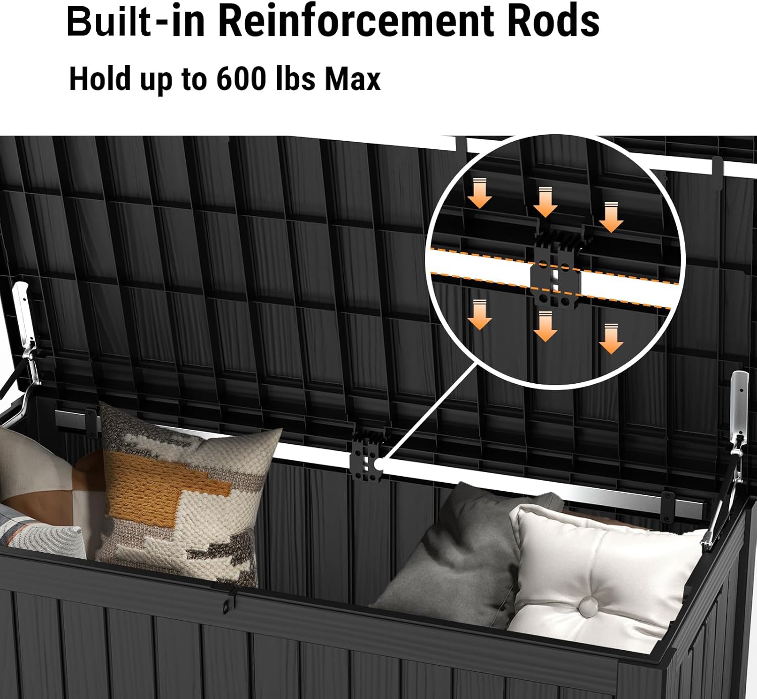 Upgrade Material: The 2025 Mars Villa outdoor storage box features upgraded thicker resin panels to minimize lid warping caused by high temperatures. Stainless steel reinforcement rods enhance support and strength, increasing the weight capacity to 600 lbs.