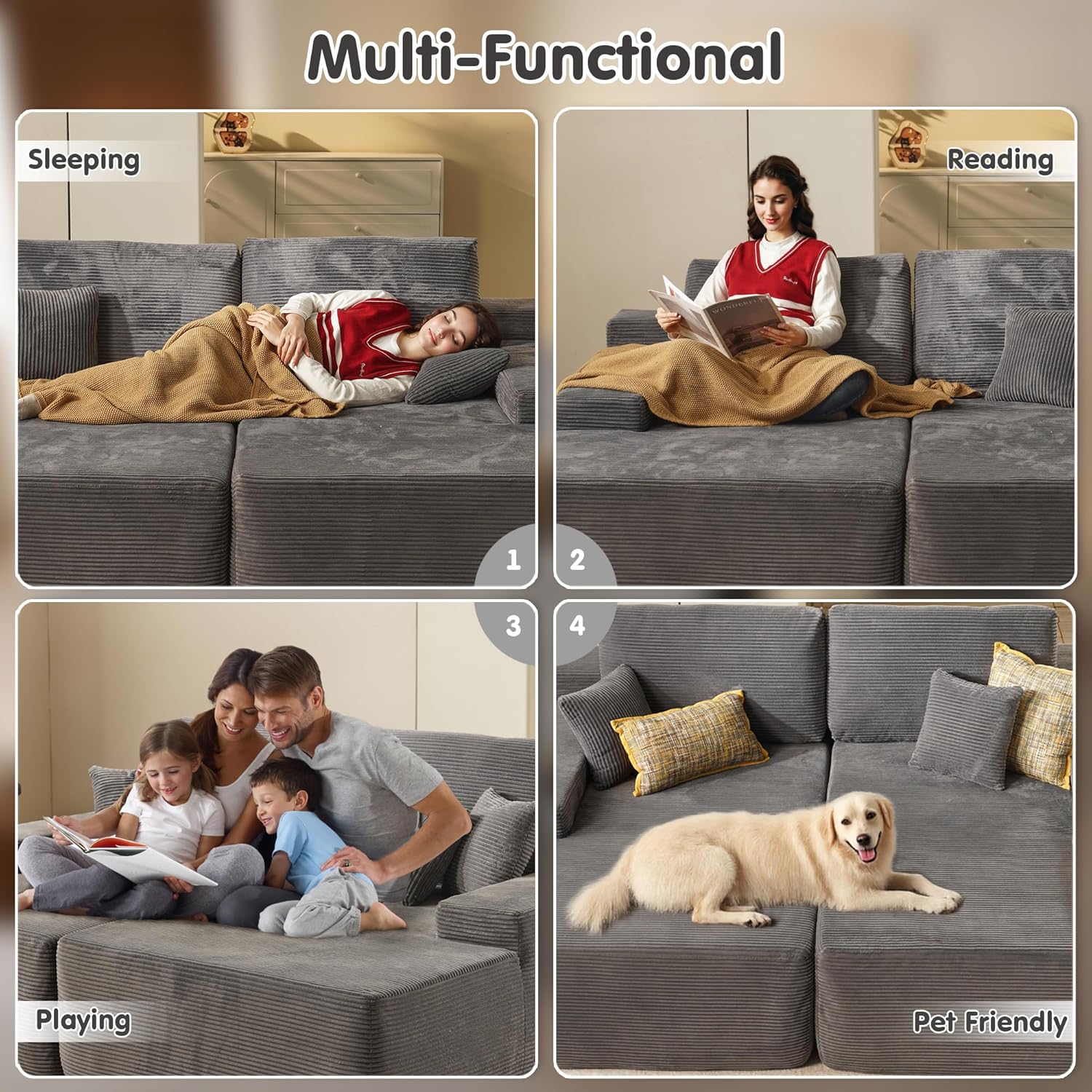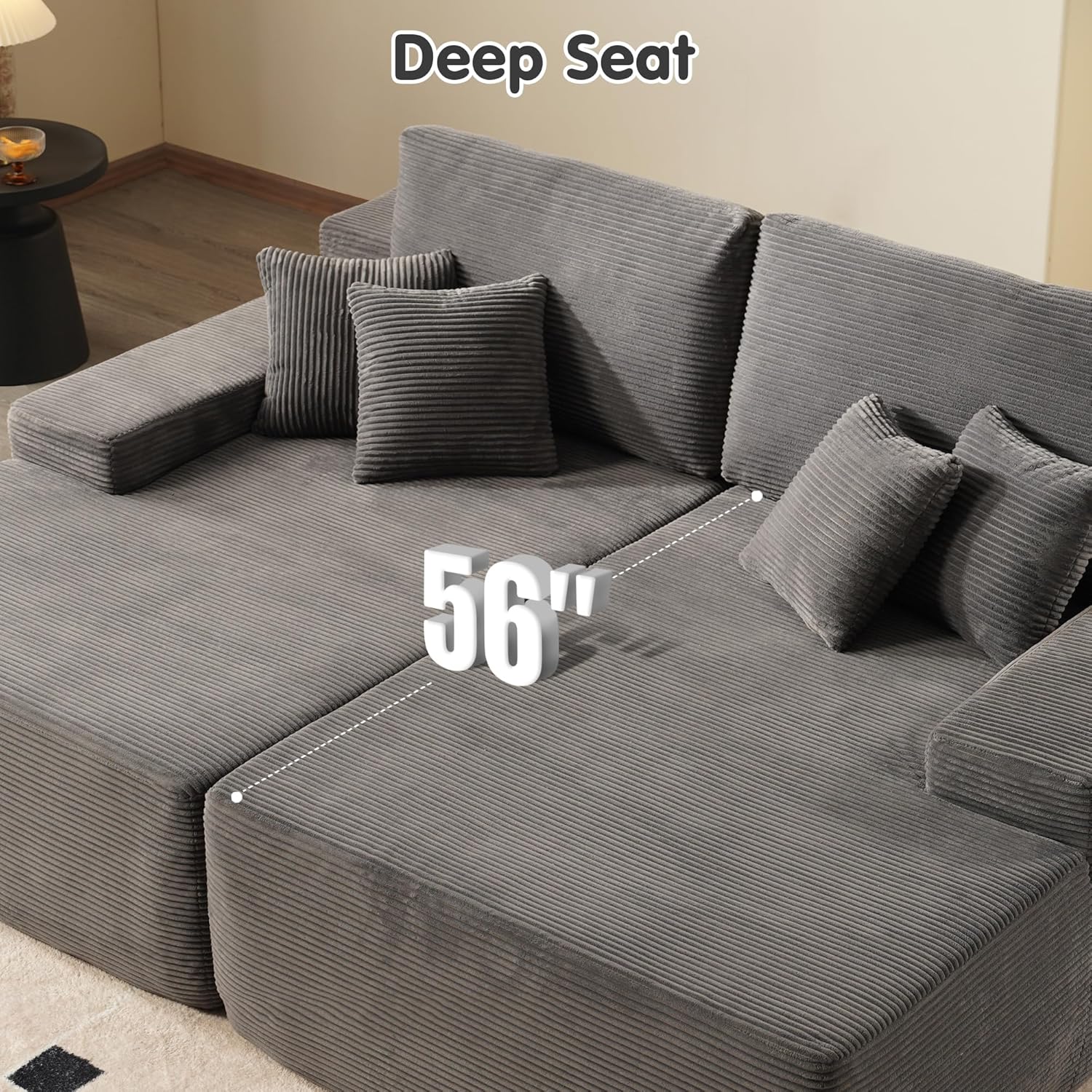 Corduroy Fabric:Experience the lavish comfort of our enhanced corduroy fabric, offering unmatched softness and warmth. Its impressive durability and stain-fighting prowess keep your sofas looking fresh and lively. With a variety of color choices, our corduroy chaise sofa lets you showcase your unique style while adding irresistible charm to your space