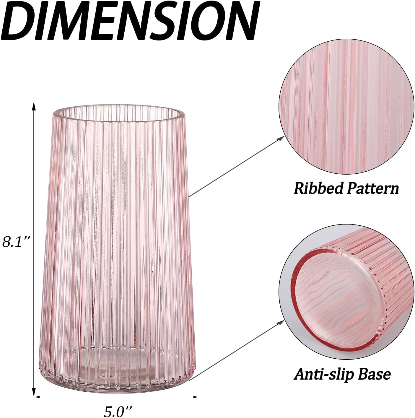 Pink Glass Vase for Flower, Flower Vase for Bouquet, Modern Glass Vases, Ribbed Vases for Living Room, Bedroom, Dining Table, Office, Wedding, Centerpieces, 8 Inches