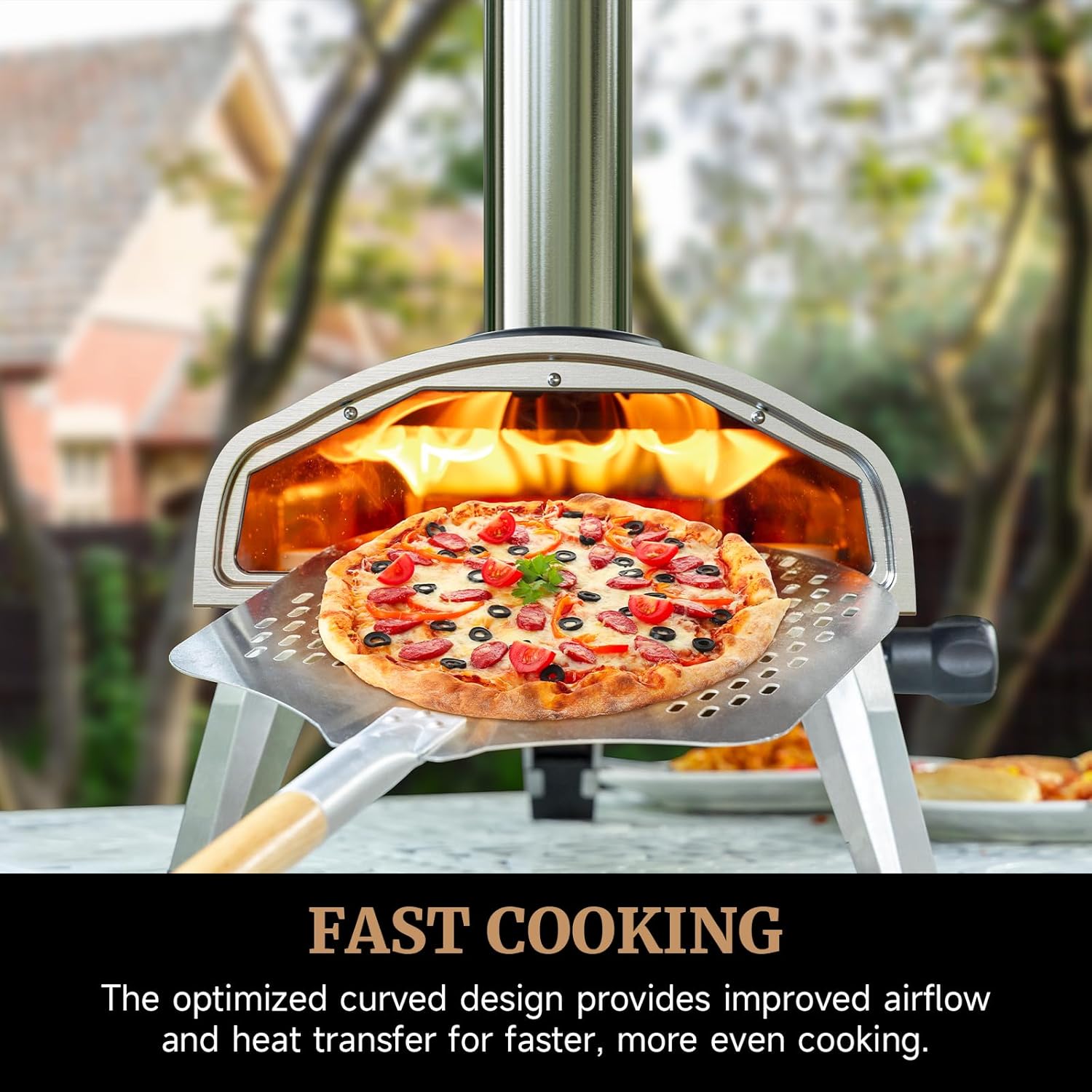 QUICKLY HEAT UP: The optimized curved design and air duct system promote fast and even cooking. The outdoor pizza oven can reach a temperature of 350°C (570-660°F) in 20 minutes, allowing you to bake crispy, soft, and smoky-flavored pizzas in 90 seconds or less. You can also explore various dishes such as roasted vegetables, juicy meats, and fresh bread.