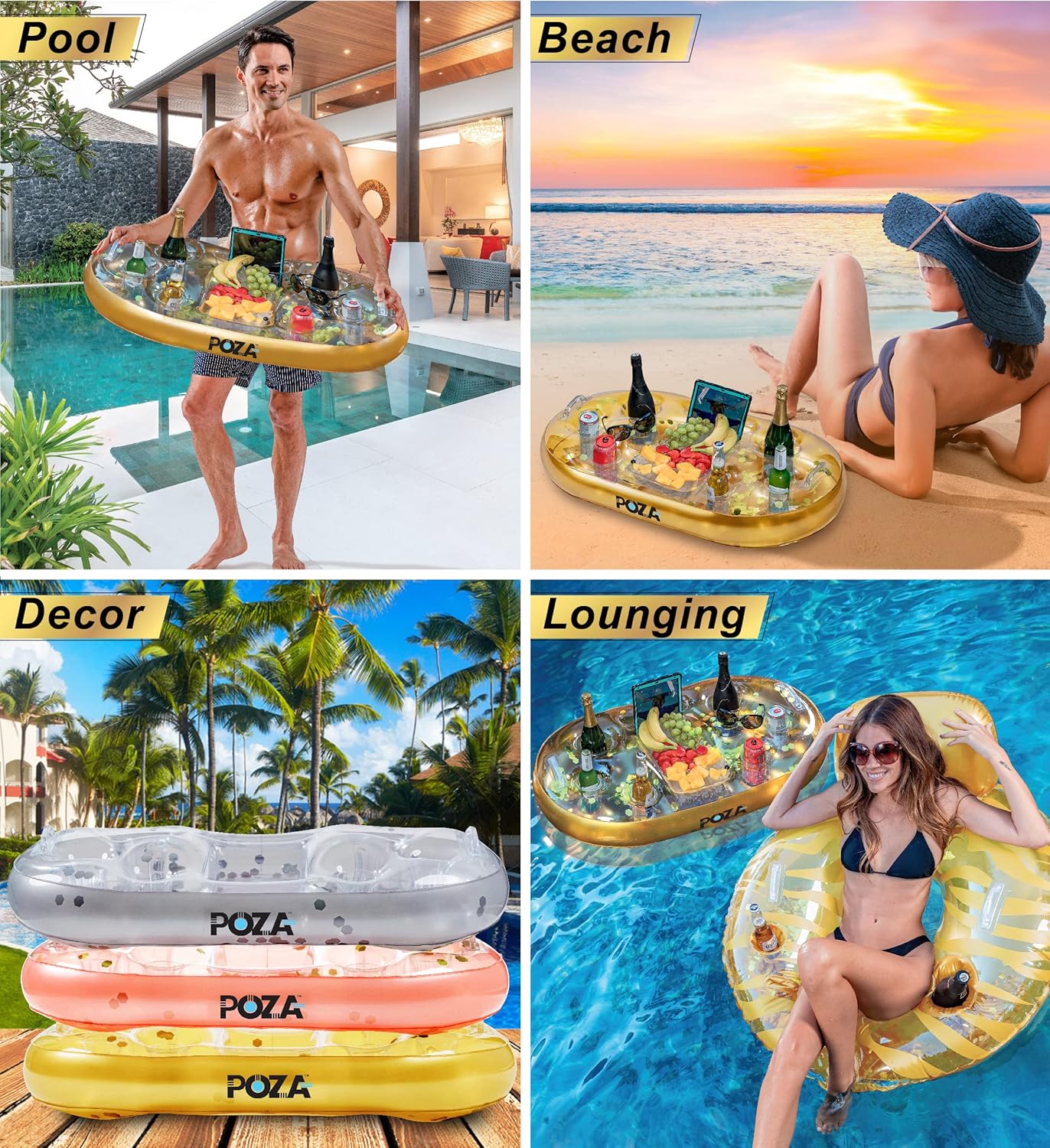 INCLUDED WITH THE PURCHASE OF INFLATABLE COOLER – Includes 1 POZA Gold Floating Drink Holders For Pool filled with sparkly gold confetti and designed with 2 handles, 8 holders for drinks, food, book, speaker, phones, or tablet. To use the floating pool tray, use the electric air pump with our advanced quick air valve system to easily inflate or deflate. The floating cooler drink holder measures 39Lx23Wx7H inches and comes with a repair patch.