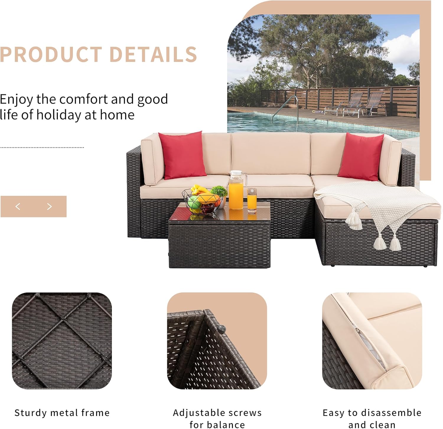 Multiple Combination: Use your imagination to create the most beautiful 5 Pieces Patio Furniture Sets. Each part of this 5- piece patio furniture could be used separately, easily allowing to be combined into different configurations according to your needs. And there’s a glass tea table where you can display your favorite things. Such as potted plants, vases and even small televisions.