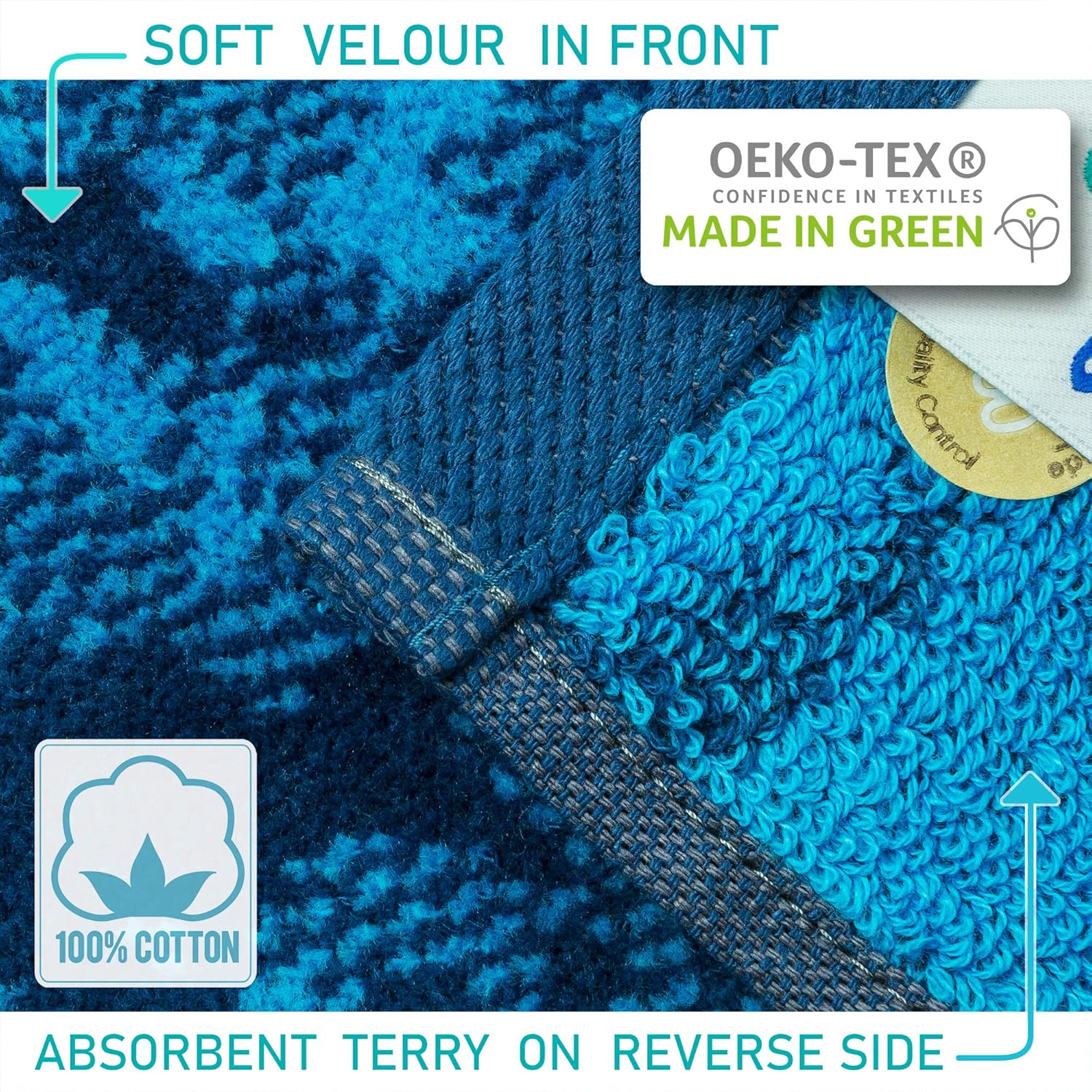 ⭐ SOFT COTTON- Woven with 100% Premium cotton to make the towels Luxuriously extra soft, comfortable and ready to dry you quickly. While the Plush Velour finished on the front side provides soft touch, the large and Fluffy terry loop on the reverse side adds extra absorbency.