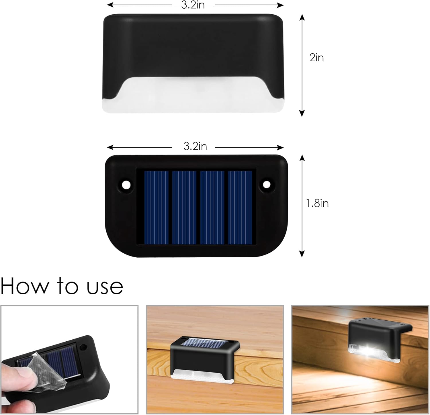 When you see the picture in their ad; it appears to be a fairly good size product. Check the solar section. However, once I received the item it came in a very small box (maybe 3 cigarette paks standing on end). All 4 lights was in the box. They are much smaller than the picture leads you to believe. The 2 way tape is extremely small & the light fixture’s flange is too small to place on the edge of my pool. I have an inground pool with coping. These lights are not large enough to fasten to the edge.