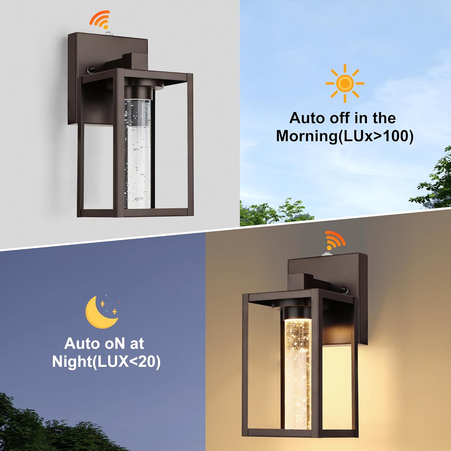 💡Built-in Sensitive Light Sensor: Equipped with a light sensor, our porch lights outdoor will automatically turn on at night and stay off during the daytime. As dusk falls, they automatically illuminate when the surrounding brightness dips below 20 lumens. And when the morning sun rises, our outdoor wall lights automatically turn off, conserving energy and ensuring effortless convenience