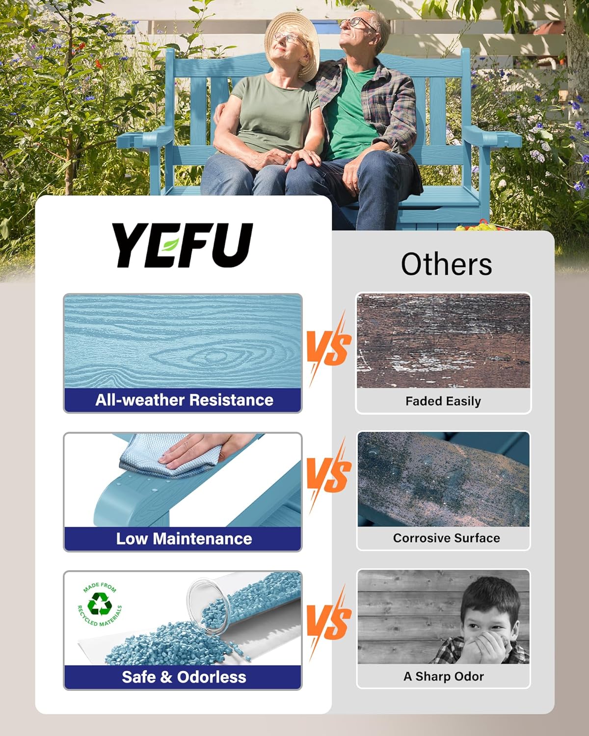 Easy Assembly and Low Maintenance: The YEFU outdoor furniture bench with storage has all the necessary tools and clear installation instructions. Pre-drilled holes make assembly easier and save more time for customers. We recommend two people to install it together. For daily maintenance, first wipe the dust with a brush or cloth, and then clean the dirt with soap.