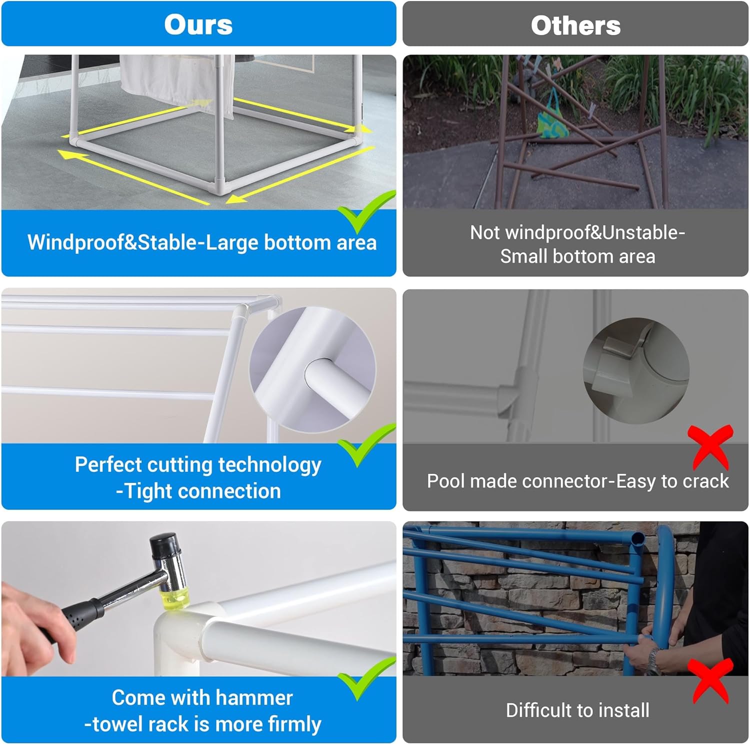 [Easy to Assemble]: Fast to set up the outdoor towel rack for pool by connecting the pipes with 3-way and 2-way connectors, along with a hammer for firmly securing connections between the pipes and connectors, and 4 towel clips for securely holding towels to the bars