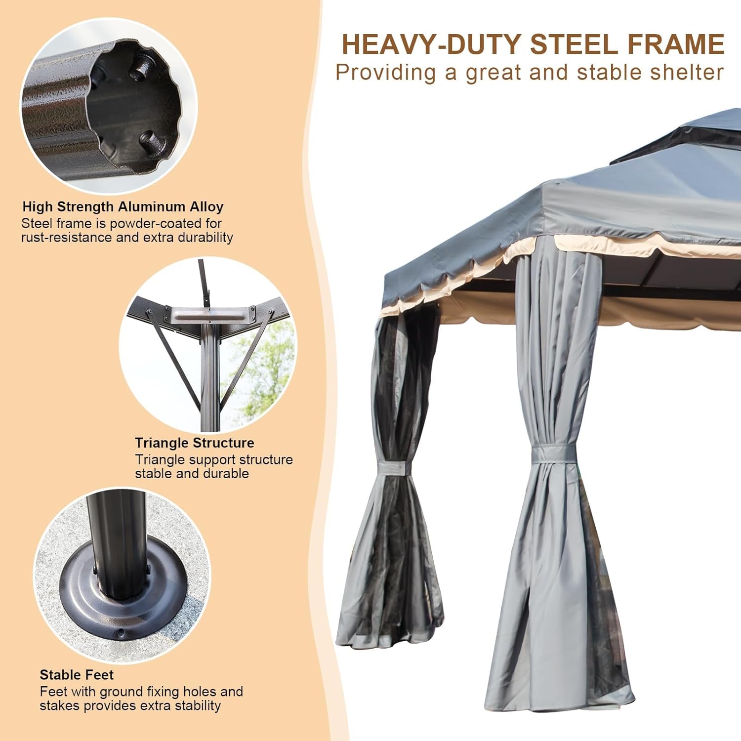 STABLE CONSTRUCTION: The gazebo canopy boasts a stable and sturdy design, complemented by ground stakes included for added security, ensuring your structure stays firmly anchored to the ground.
