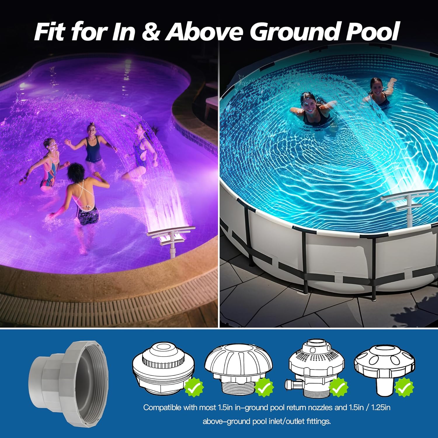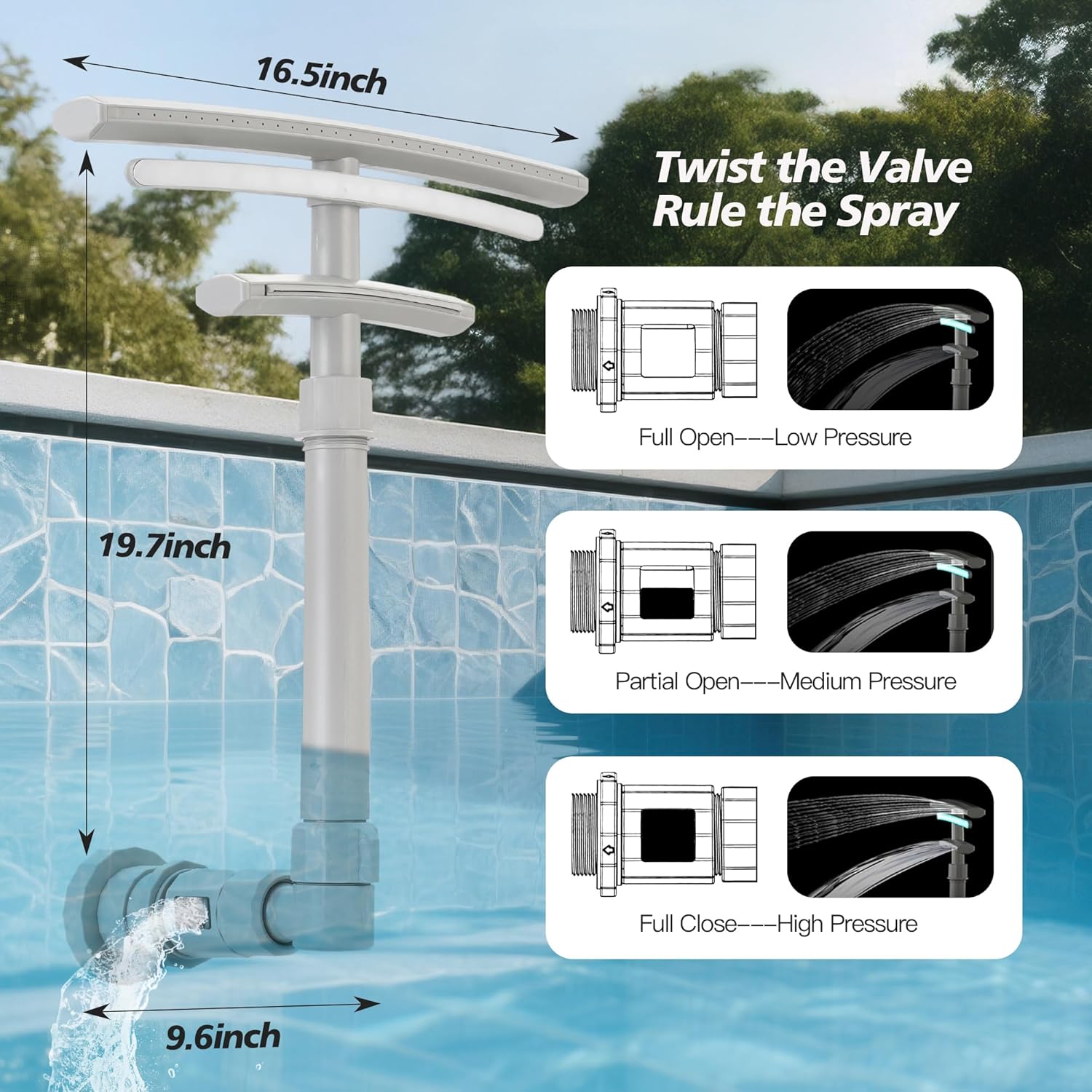 【Universal Adapter: Our Pool Fountains Universal Fit for Inground & Above Ground Pools】 Seamlessly connects to 1.5″ inground jets and 1.25″/1.5″ above-ground fittings—no extras! Pump-Powered Precision: 0.75HP+ Pumps: Up to 10 meters of thrilling sprays. 0.1HP Pumps: Up to 4 meters of refreshing mist. Skip pumps under 0.1HP (15W)—too weak to perform. Pro Tip: For peak sprays, use a pump rated at 0.2HP or higher.