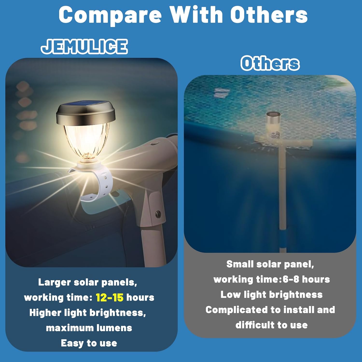 【Innovative Automatic Lighting Function】Our above ground pool accessories feature innovative day and night automatic lighting energy-saving LED lights that charge throughout the day and store energy to automatically turn on the lights when the sun sets, ensuring minimal power consumption while providing a dazzling light that enhances your pool of beauty.