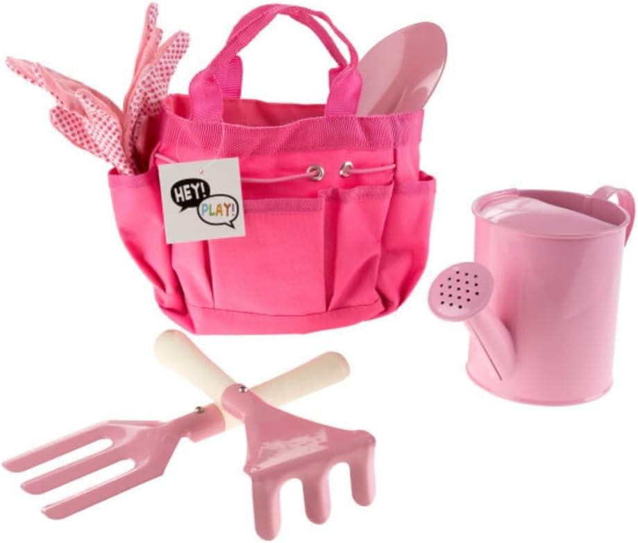 Hey! Play! Kid’s Garden Tool Set with Child Safe Shovel, Rake, Fork, Gloves, Watering Can and Canvas Tote- Mini Gardening Kit for Boys and Girls , Pink 4 x 7 x 6 inches