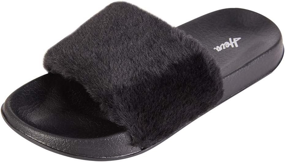 MH Bailment Womens Furry Fluffy Slippers Faux Fur House Slippers Open Toe Fuzzy Slides Soft Flat Slip On Sandals for Indoor Outdoor