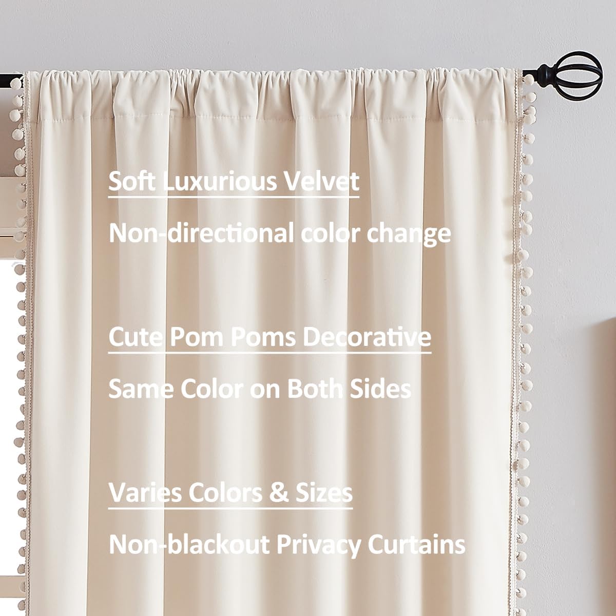 Featuring pom poms border on 3 sides that instantly captures attentionAdding another modern touch to the softness and luxury of your décorCreating a vintage and elegant look easily with these velvet cream curtainsIt will drape beautifully alone or over an existing blind with a perfect finishing touch